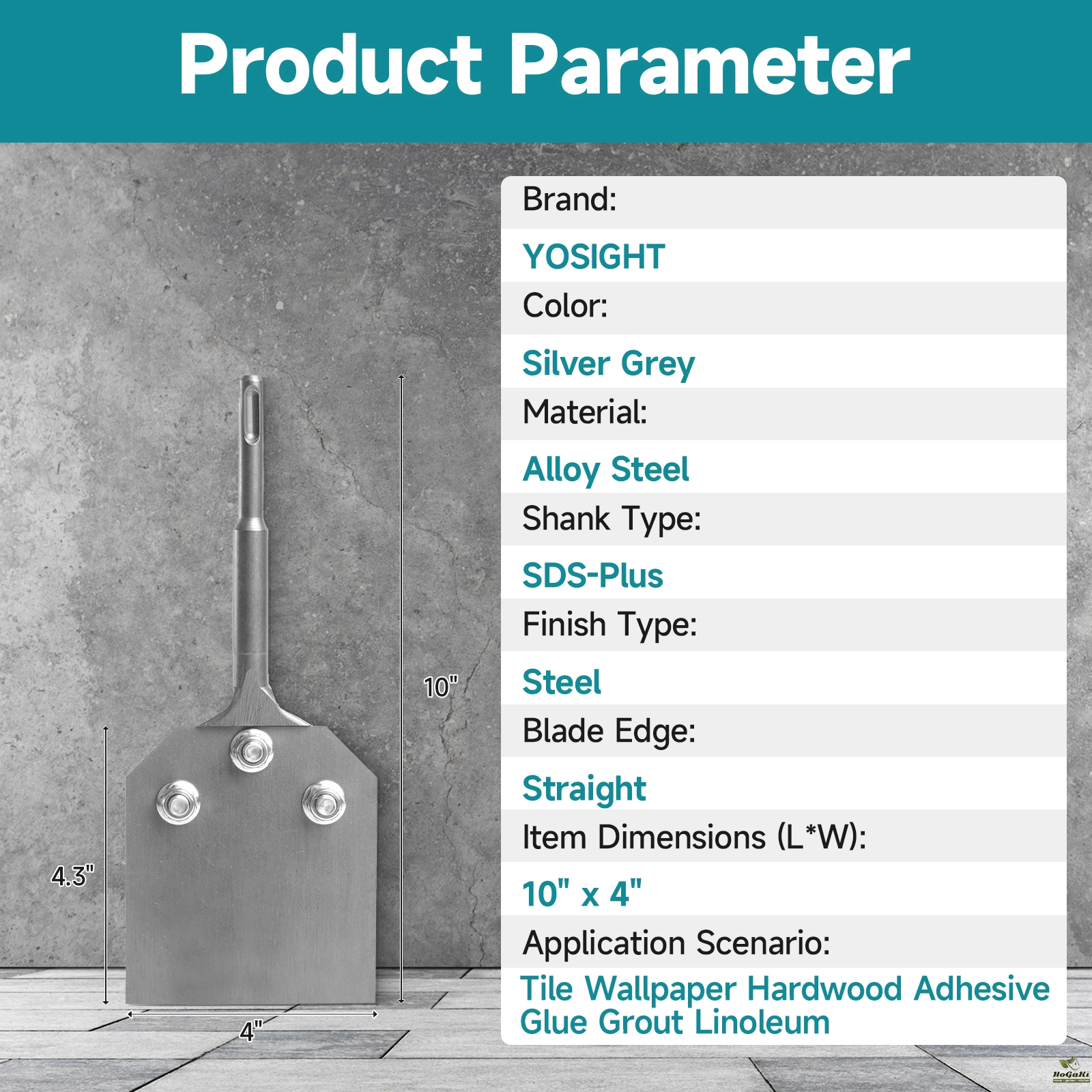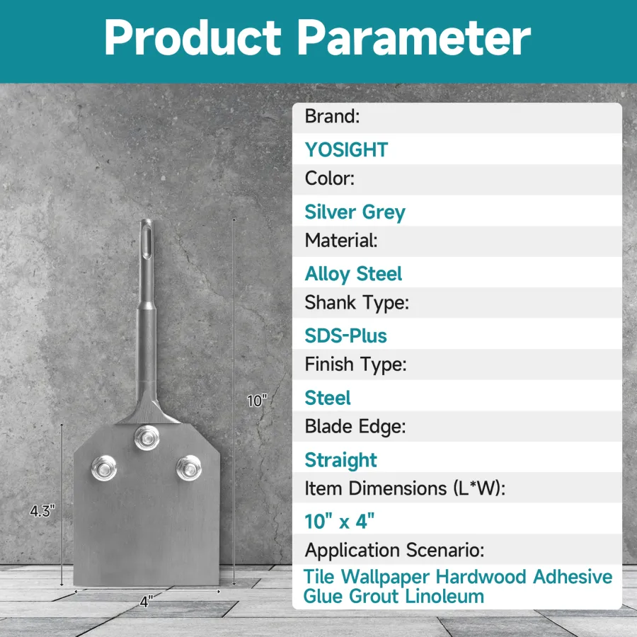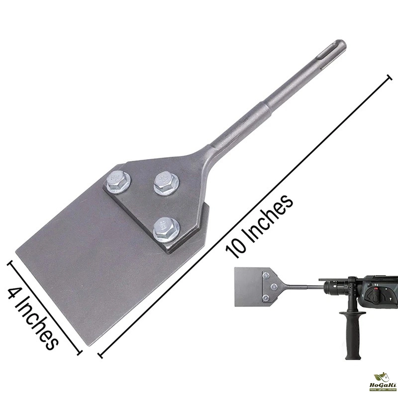 *4 inch wide blade, 10 in. overall length, the bolts have been assembled in advance. Replaceable 4 inch extra wide blade allows for more upright scraping and removes more thinset per pass.