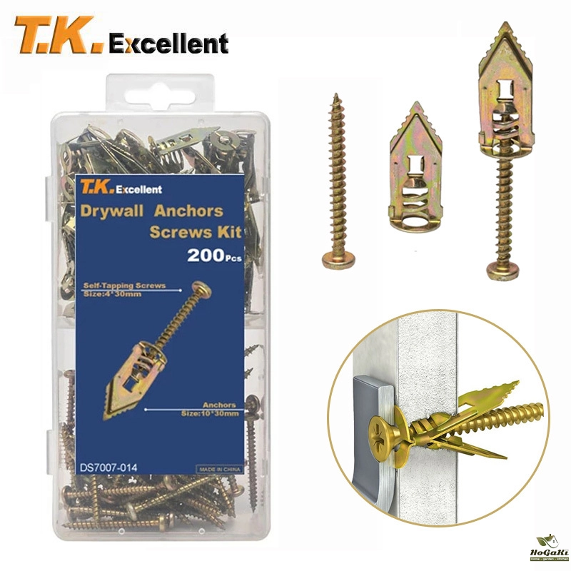 Self Drilling Drywall Anchors: These wall anchors for drywall are made of carbon steel and coated with yellow zinc, which is resistant to corrosion, rust and durable. When you tighten the drywall screws, the splits of the ribbed anchors expand on the two opposite sides for a more stable fixation.