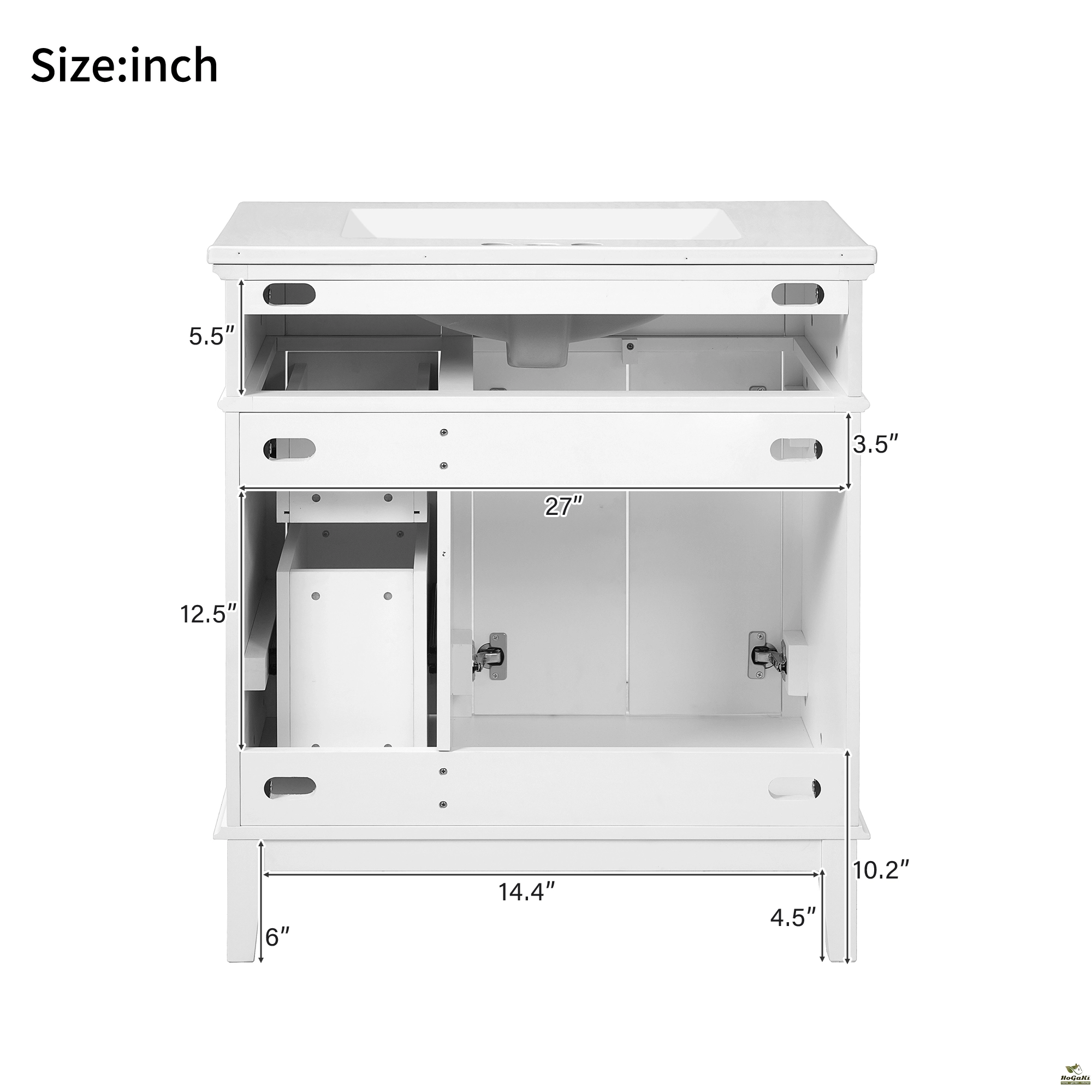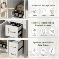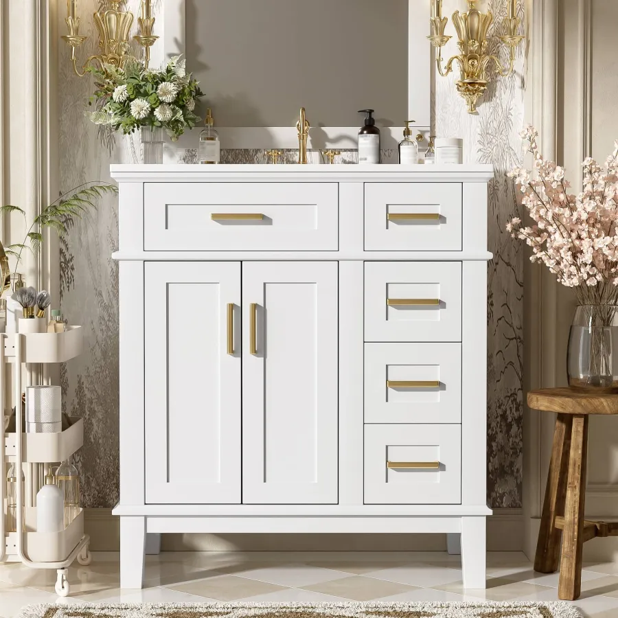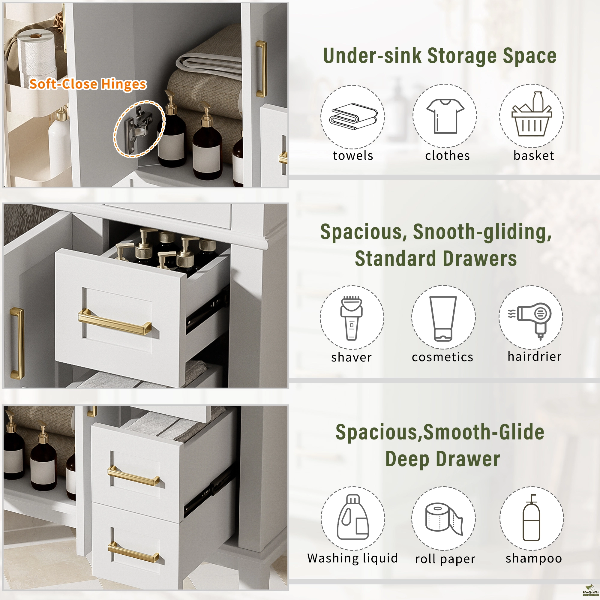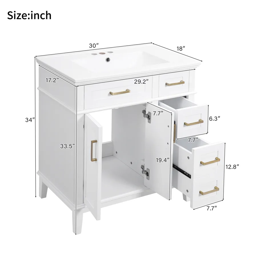 Upgrade your bathroom with this stylish and functional 30" vanity. Designed for small spaces, it maximizes storage with a deep drawer, a standard drawer, and a spacious under-sink cabinet—keeping your essentials organized and your bathroom clutter-free. The high-quality ceramic sink is easy to clean and features an overflow hole to prevent spills, ensuring a dry and tidy space. Built with a solid wood frame and premium MDF, this vanity is durable, sturdy, and long-lasting. The soft-close doors and elegant gold handles add a touch of luxury while enhancing everyday comfort. Elevate your bathroom with a perfect blend of beauty, storage, and practicality.