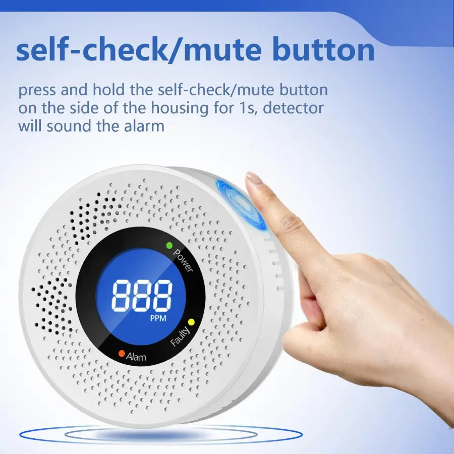 In normal status, press and hold the self-check/mute button on the side of the housing for ís, detector will sound the alarm, the red/green/yellow indicators will turn ON simultaneously, and the screen will display 888. Self-checking is recommended to be done on a weekly basis. lf you press the self-check/mute button but the detector does not work normally,contact your supplier for repair in time.