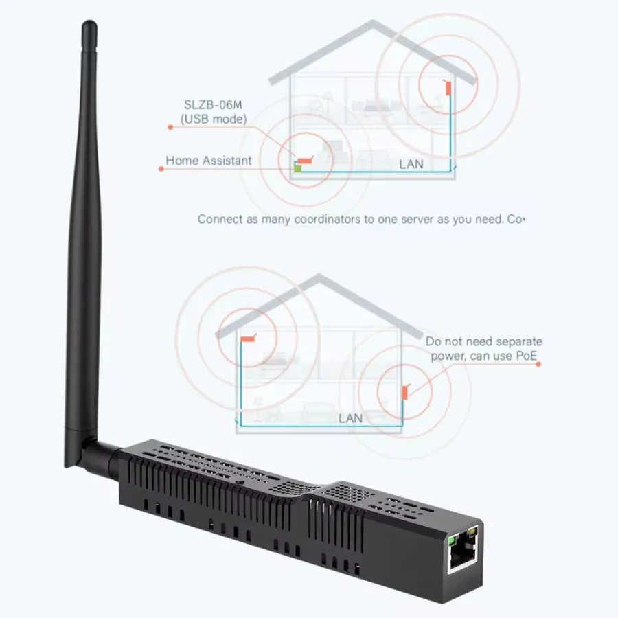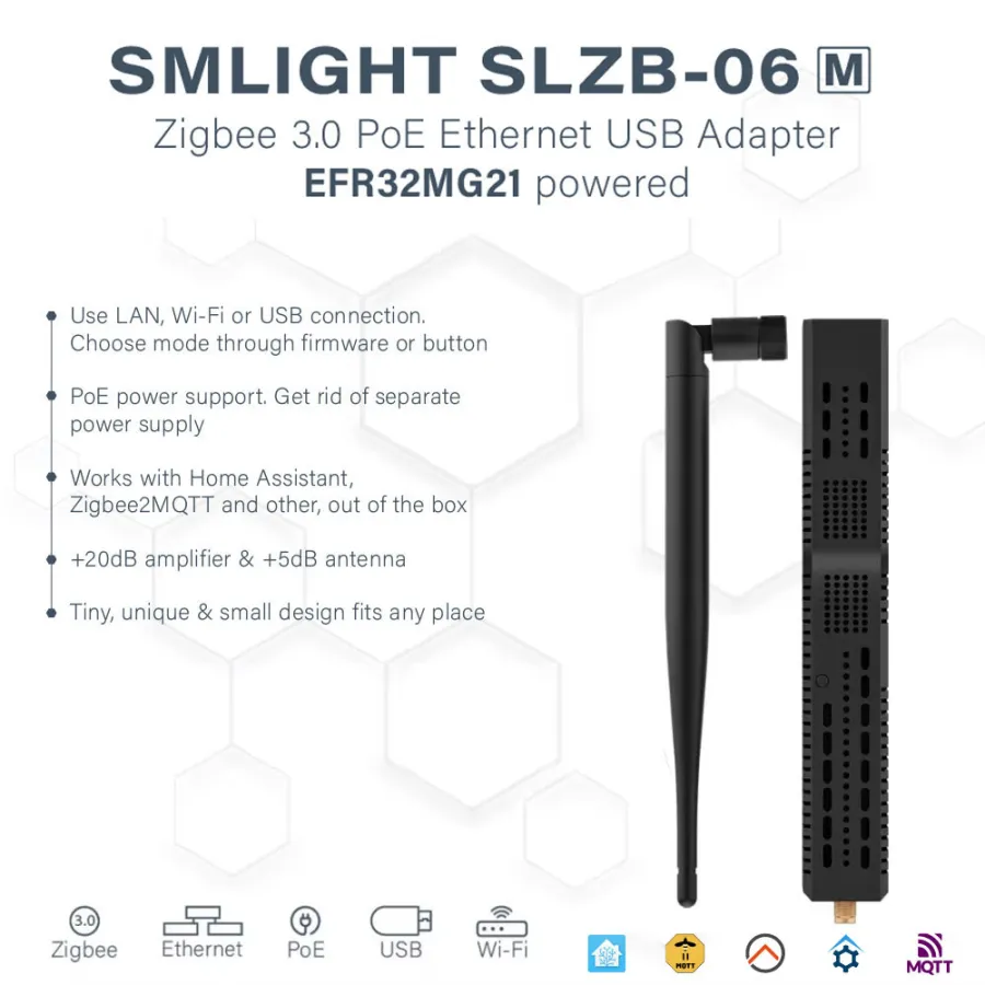 · SLZB-06 designed to work with Zigbee2MQTT or ZHA integration for Home Assistant.
