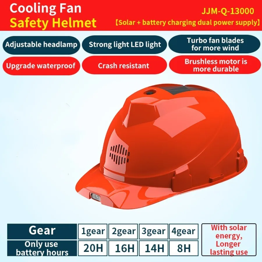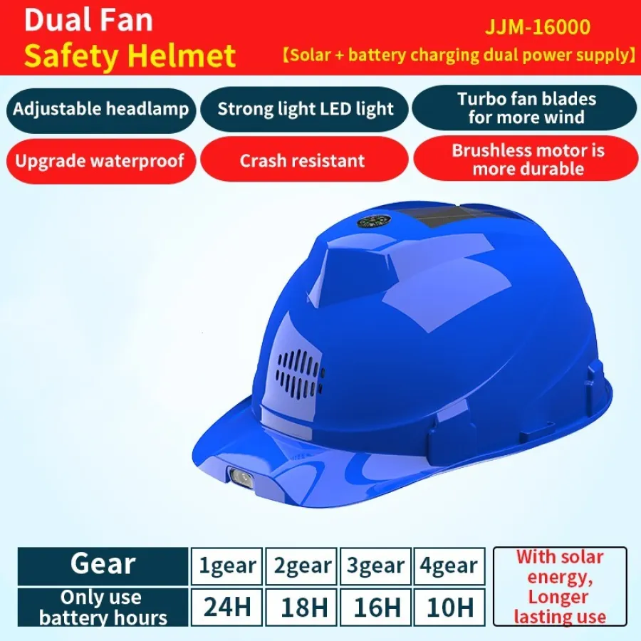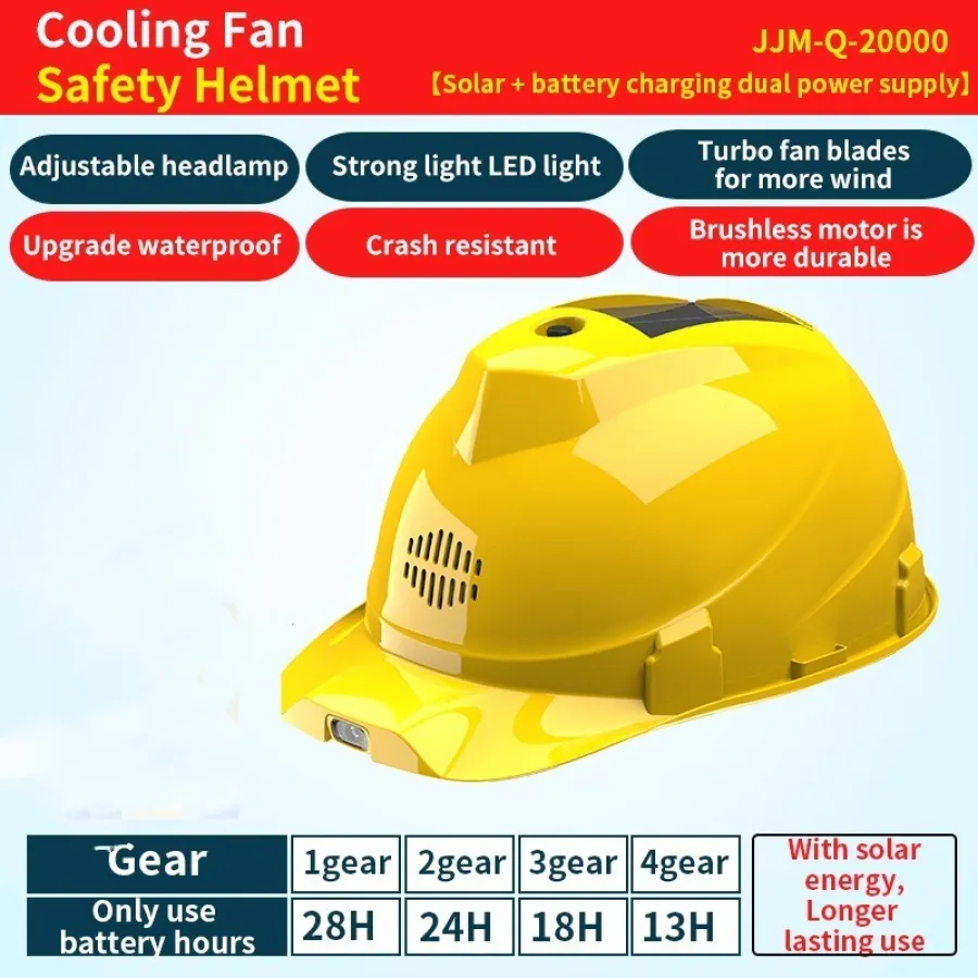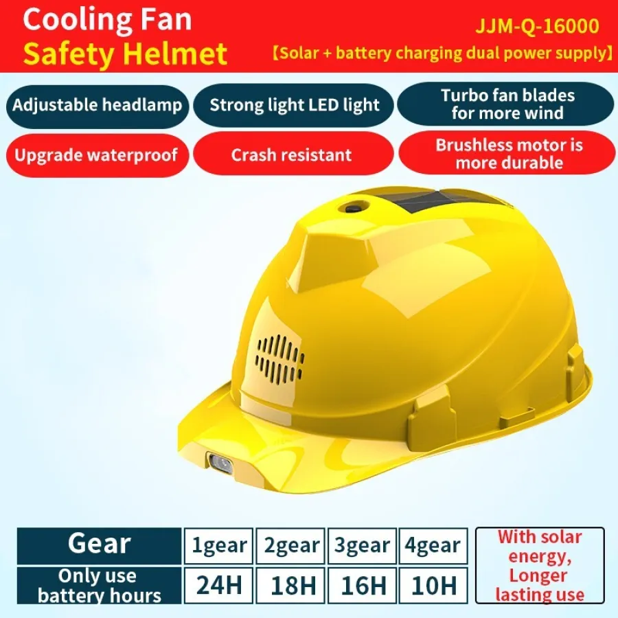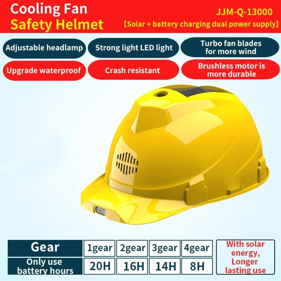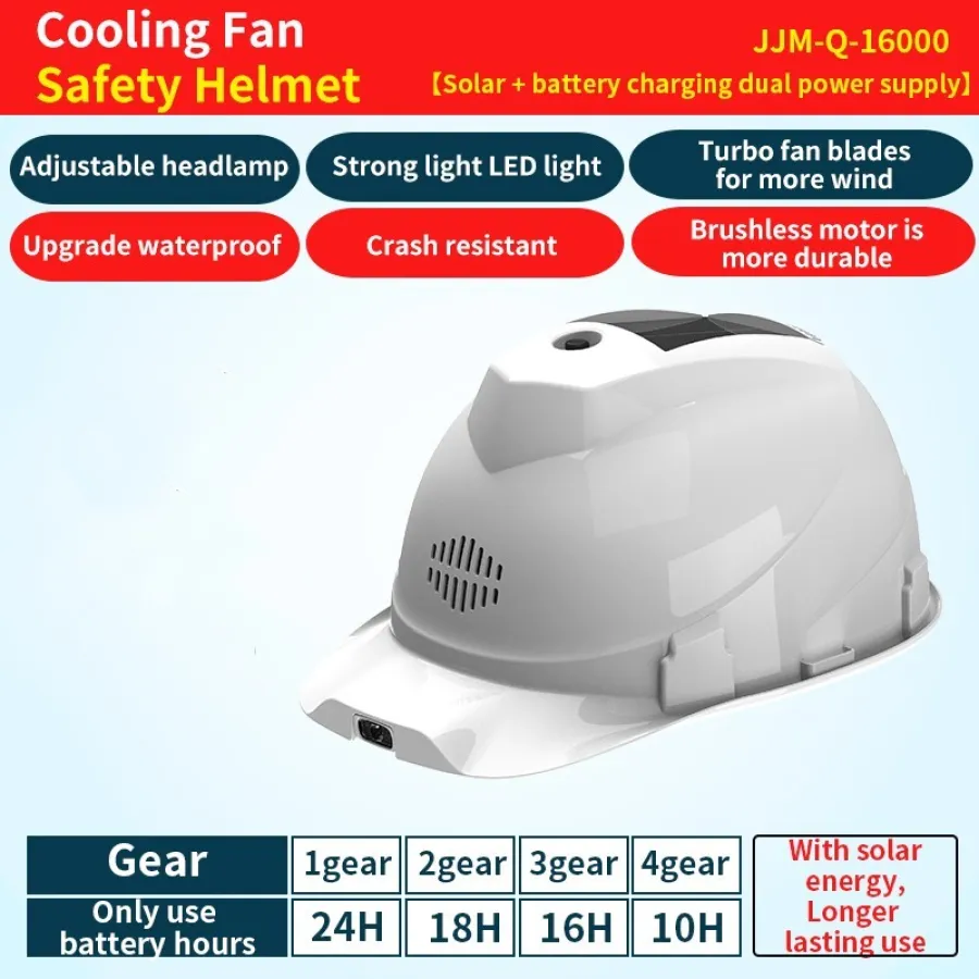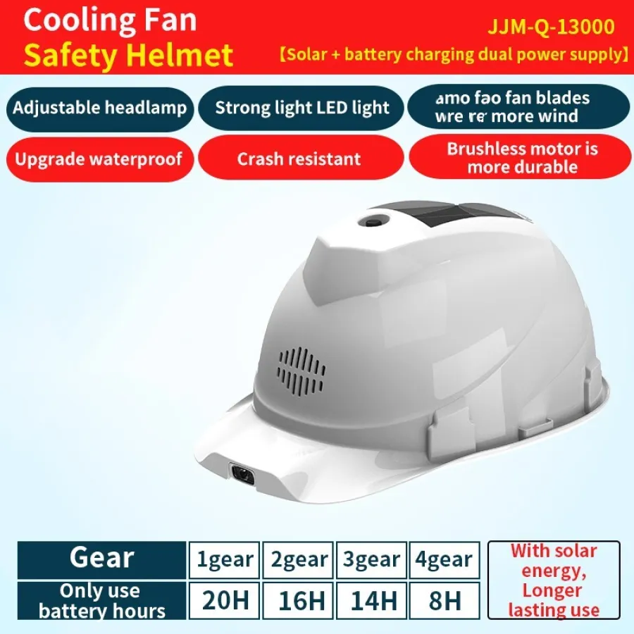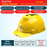 Certified Construction Safety Helmet with 2 Turbo Fans, Nano Spray Air Condition(JJM-Q), Large Rechargeable Lithium Battery, 5W Adjustable LED Headlight, LCD Display, 1 Solar Panel, and IPX6 Waterproof Design
