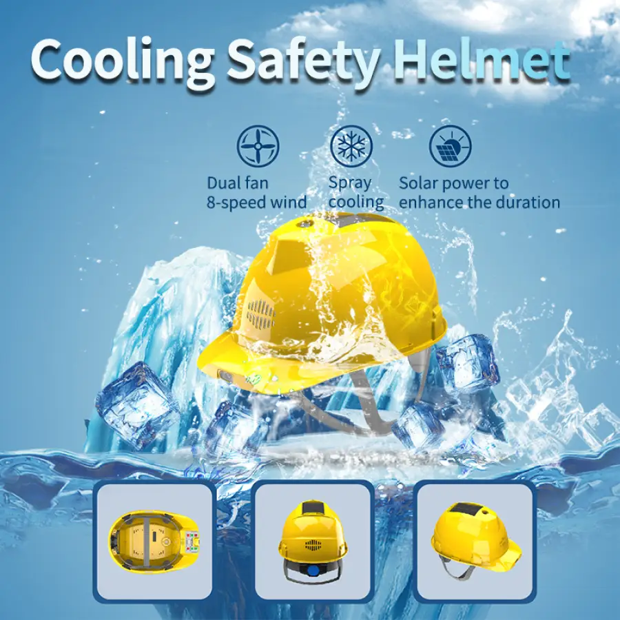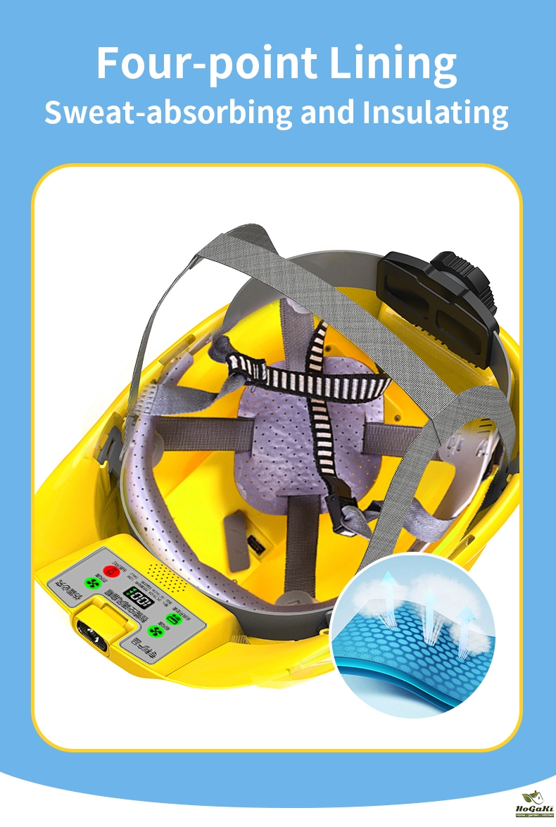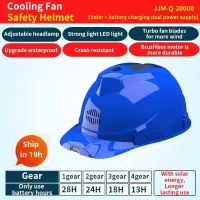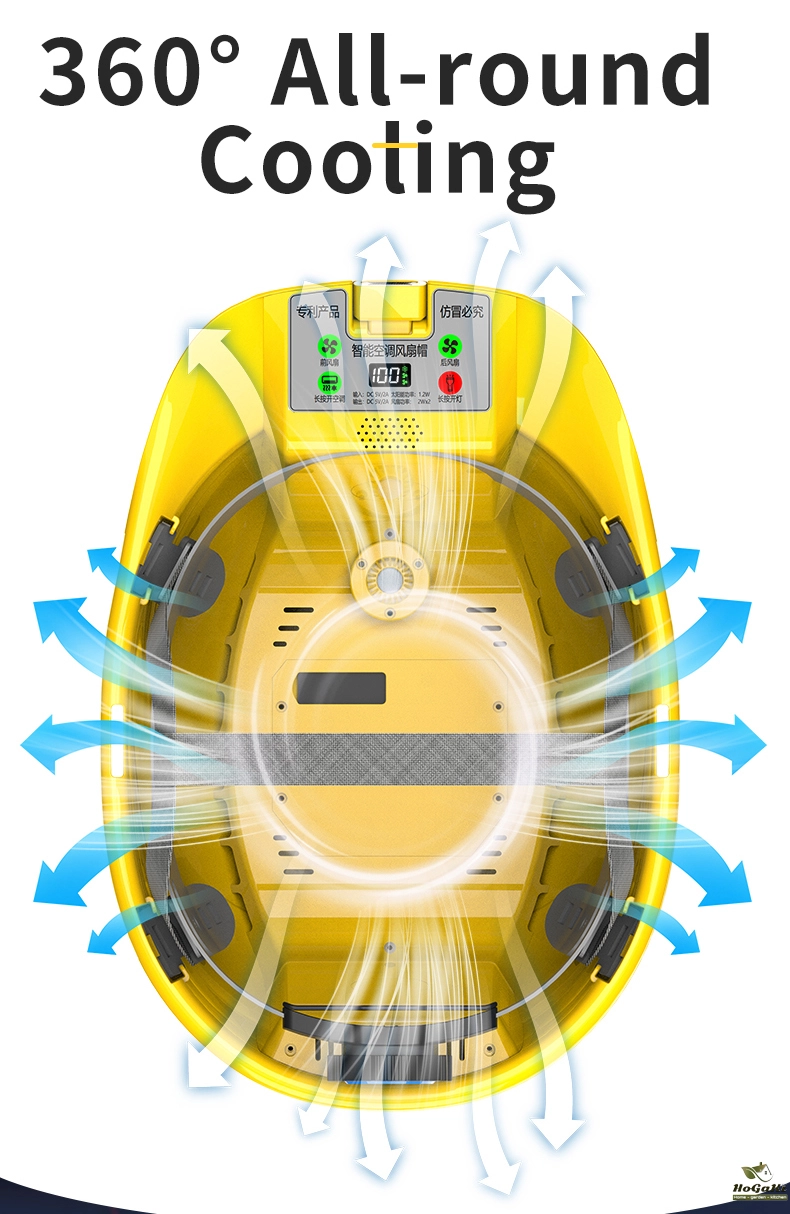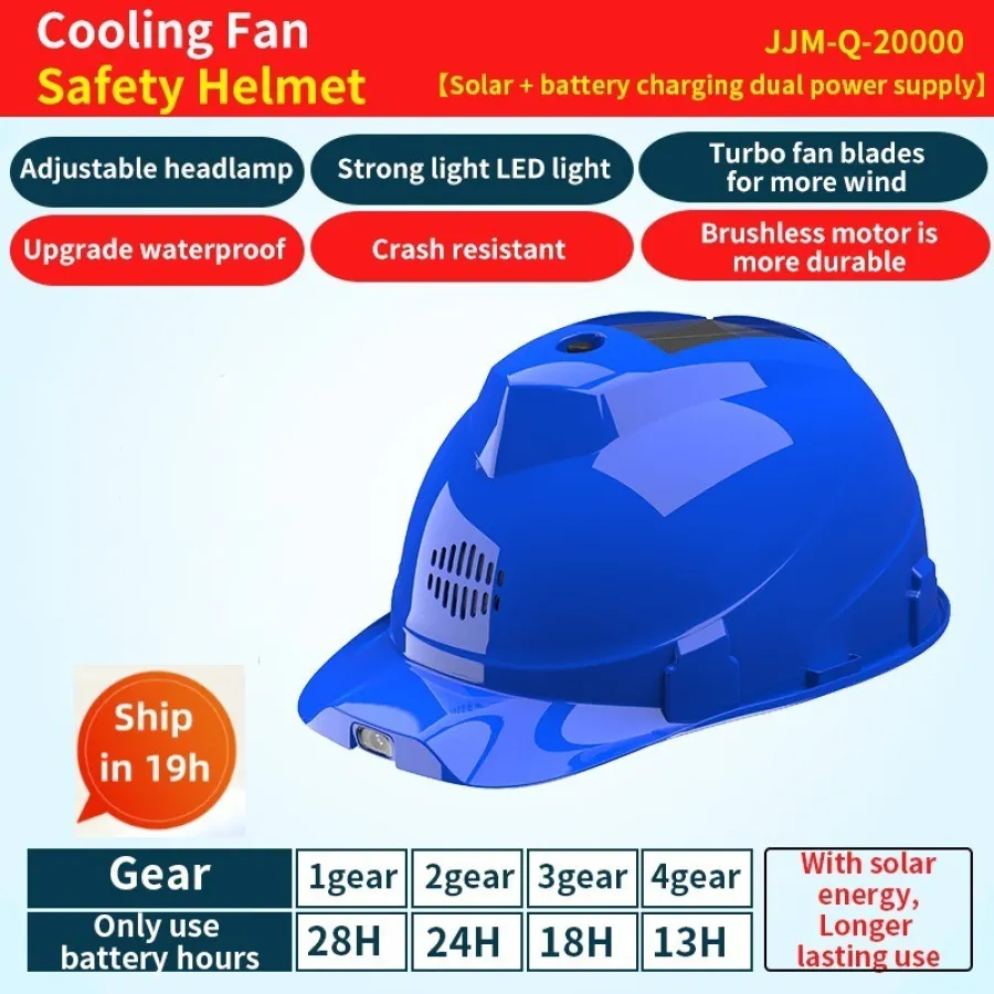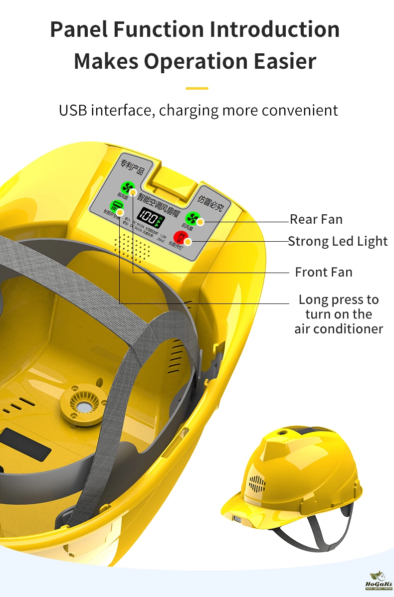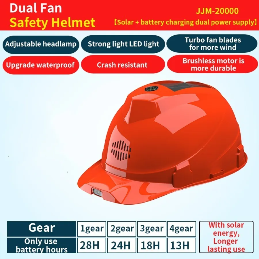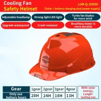 Certified Construction Safety Helmet with 2 Turbo Fans, Nano Spray Air Condition(JJM-Q), Large Rechargeable Lithium Battery, 5W Adjustable LED Headlight, LCD Display, 1 Solar Panel, and IPX6 Waterproof Design