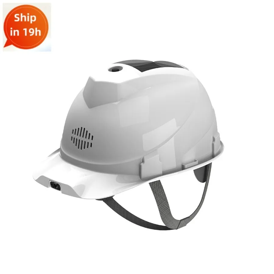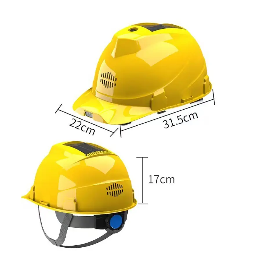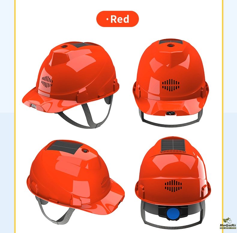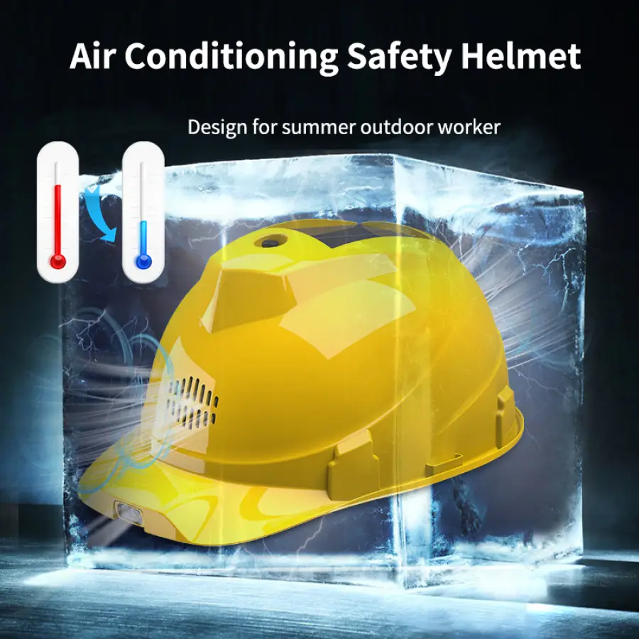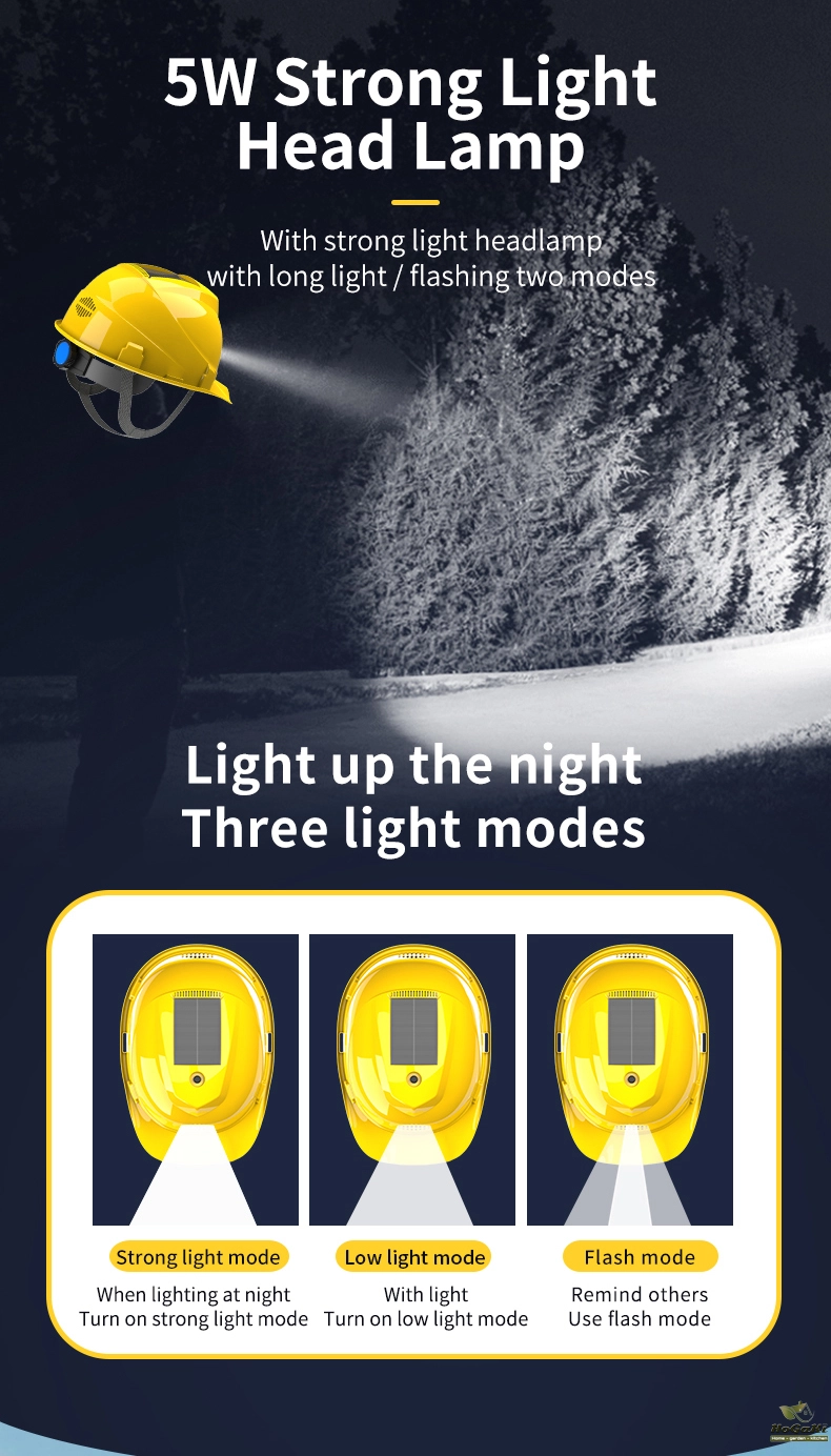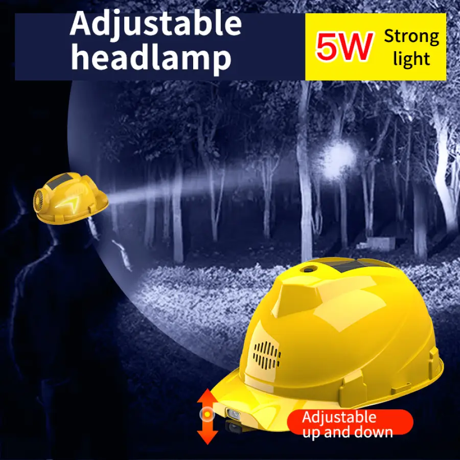 Certified Construction Safety Helmet with 2 Turbo Fans, Nano Spray Air Condition(JJM-Q), Large Rechargeable Lithium Battery, 5W Adjustable LED Headlight, LCD Display, 1 Solar Panel, and IPX6 Waterproof Design