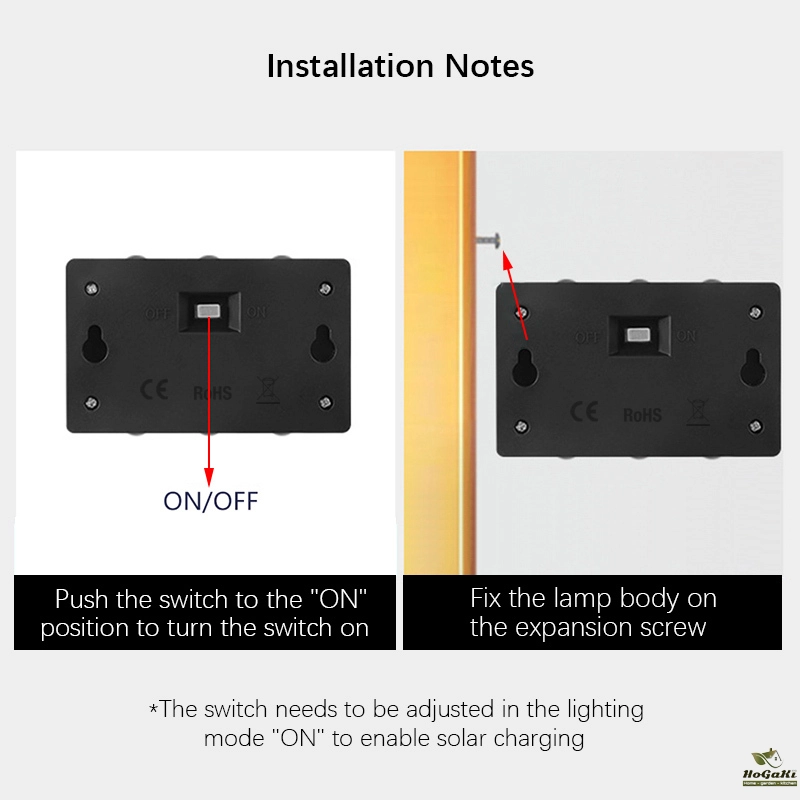 【Easy to Install】 No wires or adapters required. You can use the included screw or double-sided tape to fix it to the wall. Before installing the wall lamp, please press the on/off button to turn it on, so that the solar wall lamp can be charged in sunlight and illuminated normally at night.