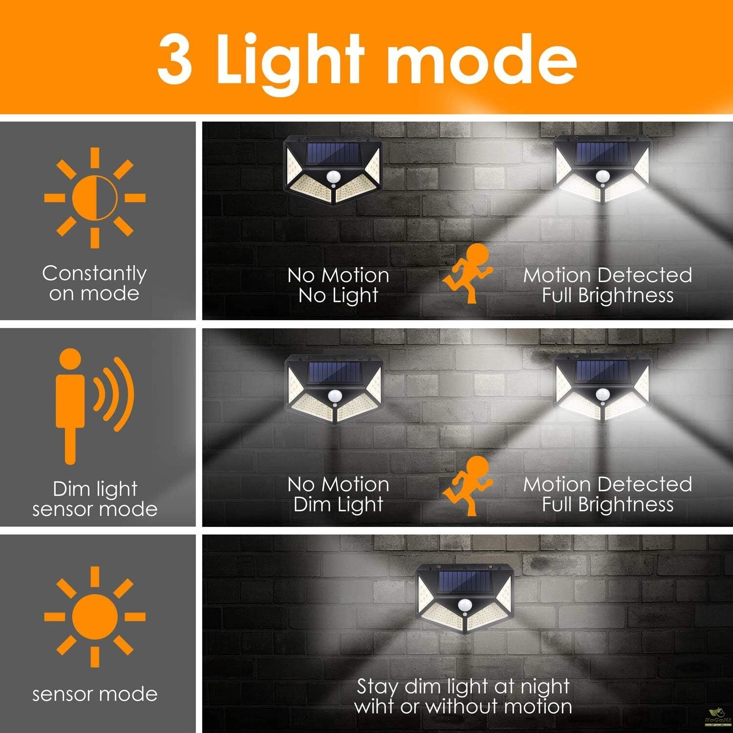 · ☀【3 Intelligent Lighting Modes】 1) Strong lighting mode - when people passed by, the motion sensor lights will light up with maximum brightness, and will turn off when there is no one nearby. 2) High light + slight lighting mode, when people passed by, the solar lights will light up with maximum brightness. When no one passes by, solar wall lights always light in dim mode. 3) Slight light mode, the motion sensor light is always in a slight light state no matter if there is no one passing by.