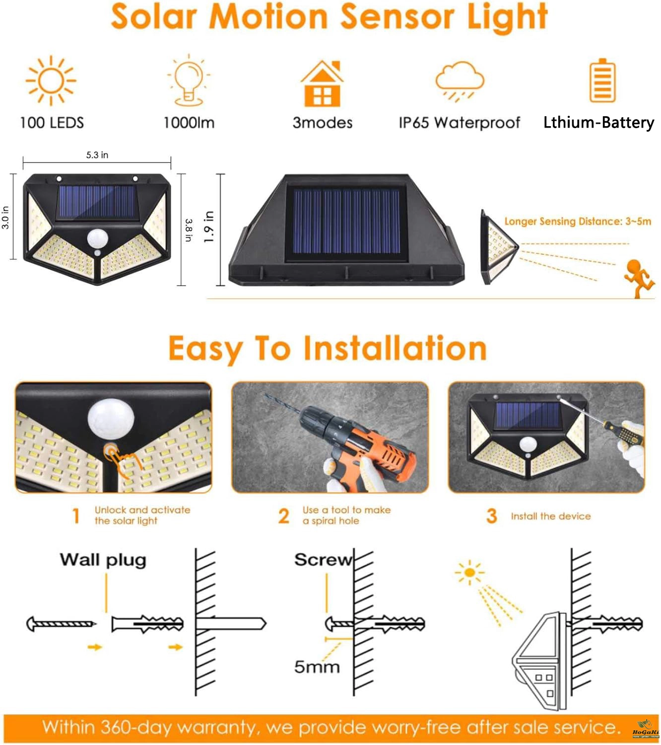 · ☀【100 LED Ultra-Bright Solar Motion Lights Outdoor】 6 pack solar lights outdoor are equipped with 100 brighter LED beads each pack , which have higher brightness and longer service life. These solar lights are equipped with 1200mAh battery and only take 6-8 hours to be fully charged under direct sunlight. The lighting angle is up to 270°, which brings the wider and brighter lighting area and make your way home safer and warmer.