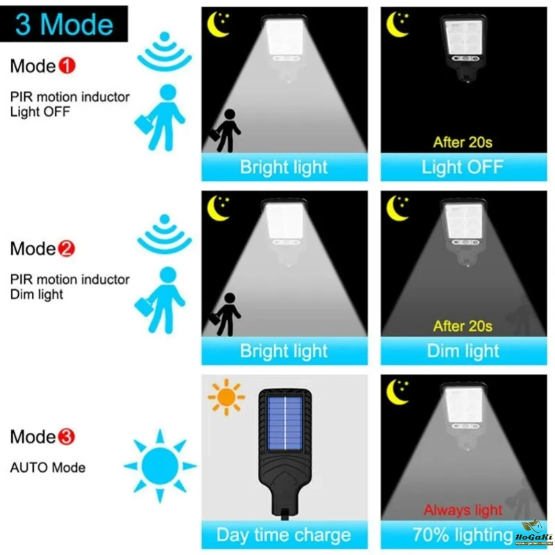 Mode 1: human body detection mode (the light power 100% brightness when aperson walks by, and it is off after 20 seconds)Mode 2: human body induction + low light mode (the light power 100%brightness when people pass, and power 30% dim brightness after 20seconds)Mode 3: Light up with 50% low brightness always.