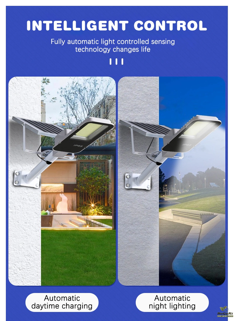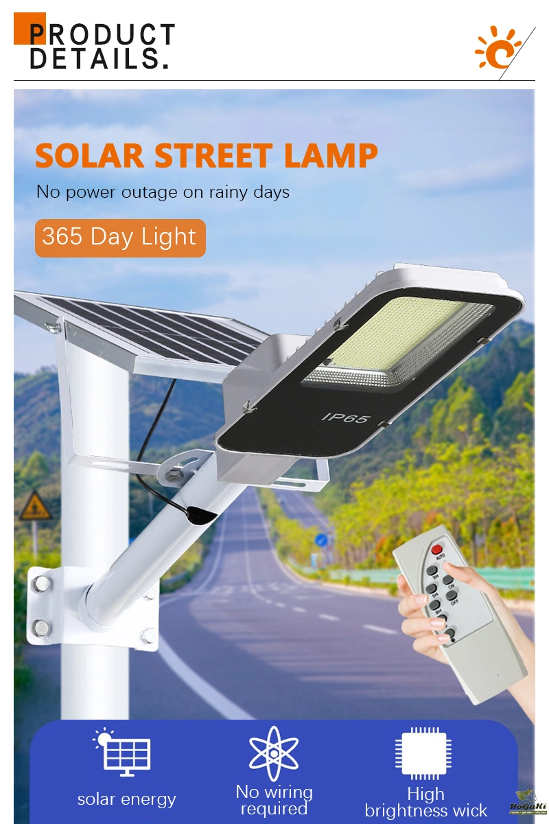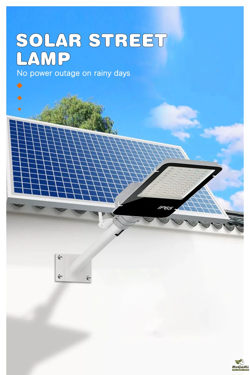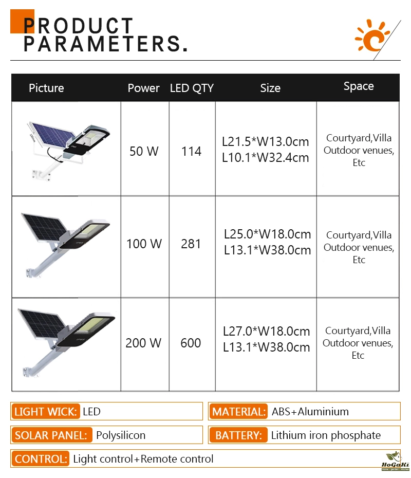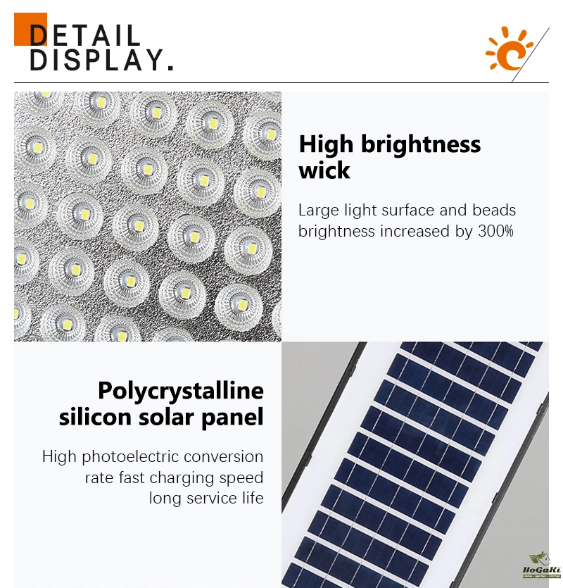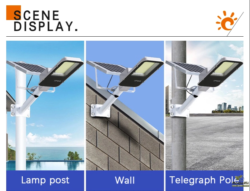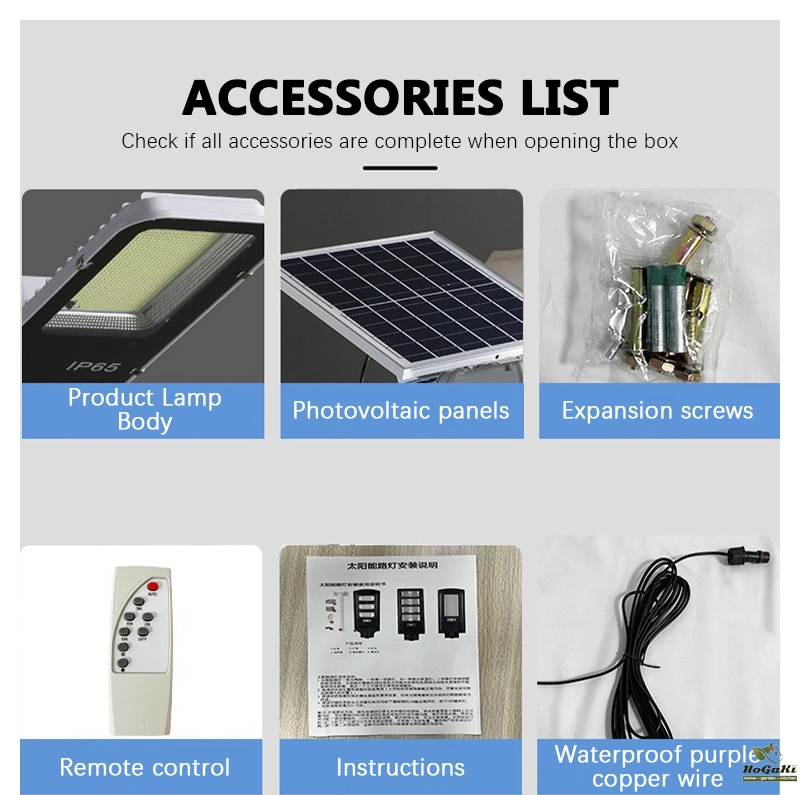 Accessories: remote control, installation screws, user manual, lighting fixtures, solar panels. Installation bracket