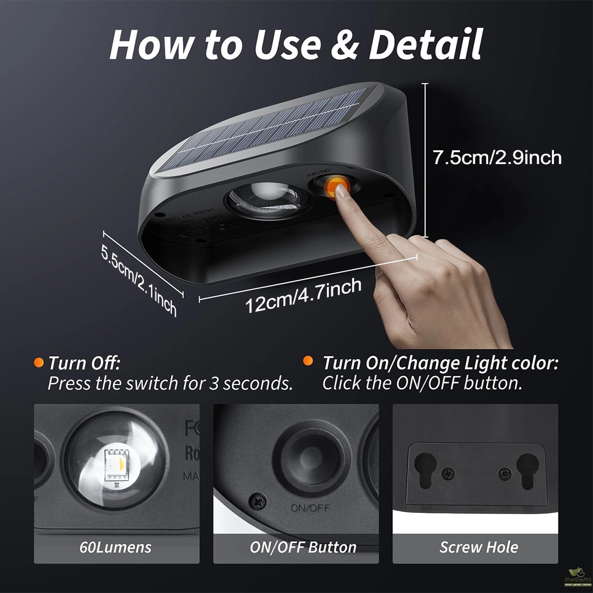 【2024 Upgraded Solar Fence Light】-- Adopts a new upgraded brightening condenser lens, our fence light can emit more concentrated and brighter light, up to 50 lumens. Illuminating the inverted "V" shape on the wall and the semicircular lights on the ground will decorate your courtyard and make it more outstanding