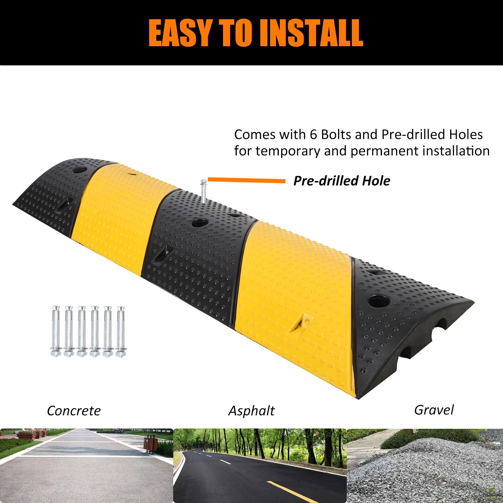 EASY TO INSTALL - Features mounting holes to install and fasten speed bumps on gravel, asphalt, and concrete roads using the included bolts and drill bits. Modular design allows multiple speed bumps to be attached to cover longer cables. You Can Get: 2 end caps, 1 pcs 72'' speed bump, and 6 bolts