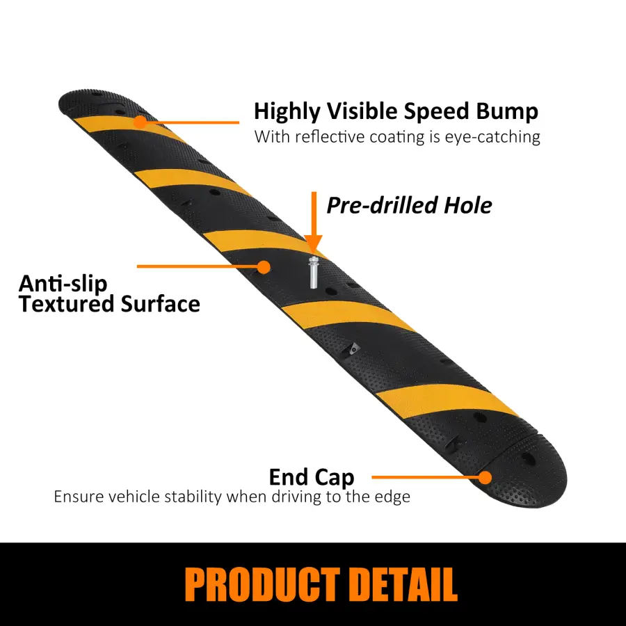 EASY TO INSTALL - Features mounting holes to install and fasten speed bumps on gravel, asphalt, and concrete roads using the included bolts and drill bits. Modular design allows multiple speed bumps to be attached to cover longer cables. You Can Get: 2 end caps, 1 pcs 72'' speed bump, and 6 bolts