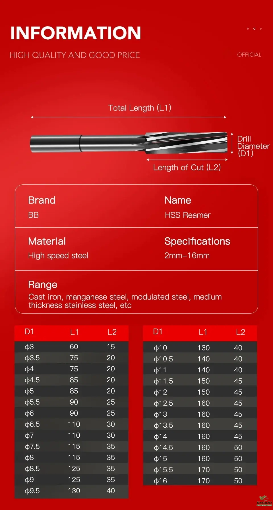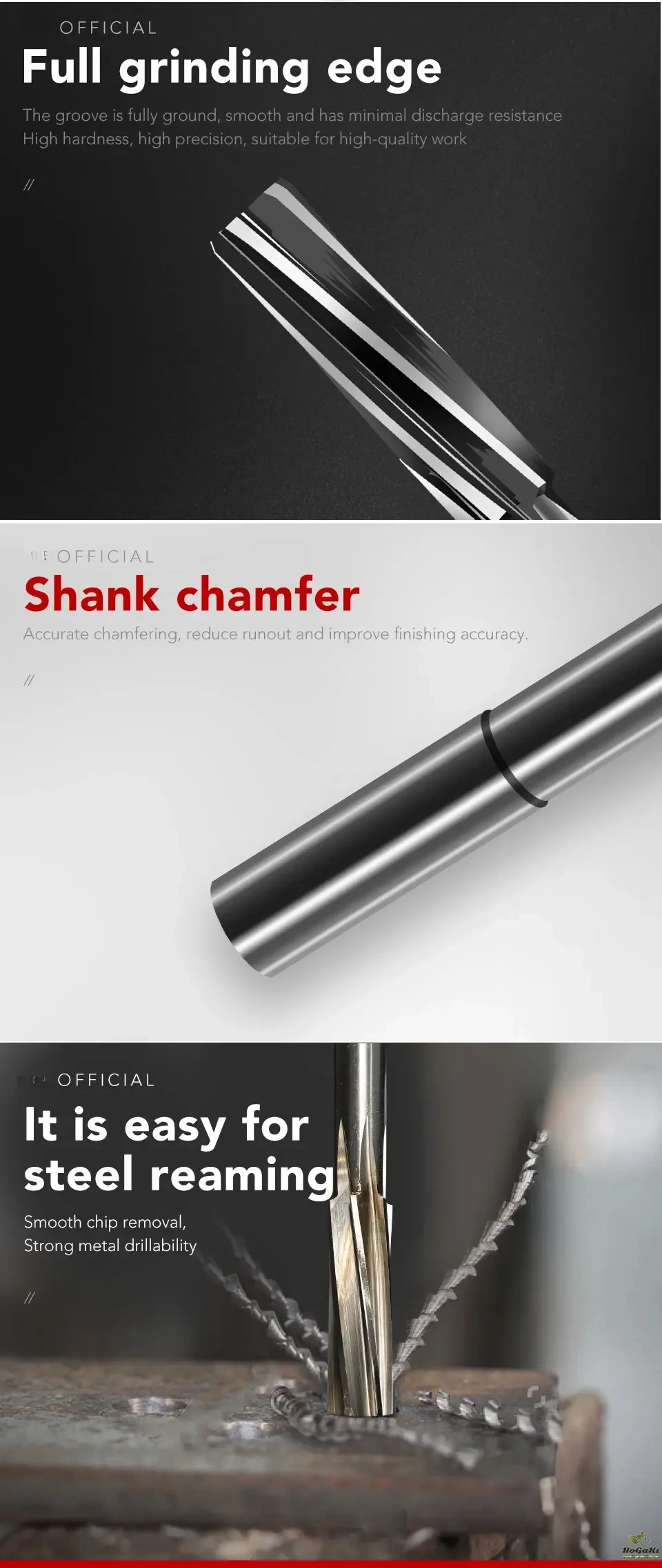 HSS H7 extended straight shank machine reamer 3-12mm, 100, 220, 300mm total length, suitable for mechanical chuck reamers