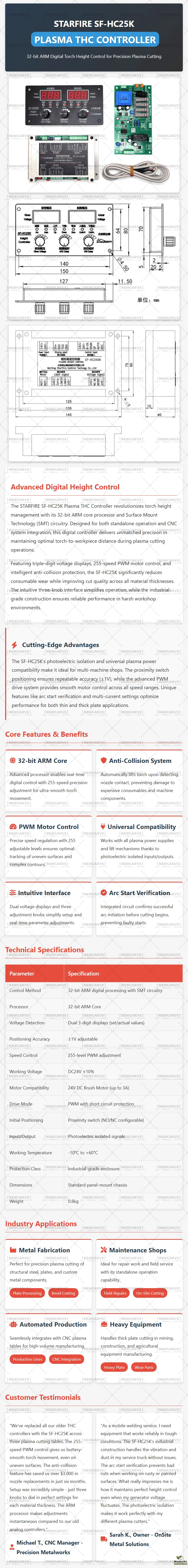 The SF-HC25K is a torch height controller for portable plasma cutting machines. It features a 32-bit arm core, digital control, and a user-friendly interface. This controller provides precise motor speed control, multi-speed current settings, and short circuit protection. It also includes an anti-collision function to safeguard the cutting nozzle. Compatible with various plasma power supplies, the SF-HC25K can be used with plasma cutting CNC systems or as a standalone controller. Requiring a DC24V power supply, it is easy to install and operate.