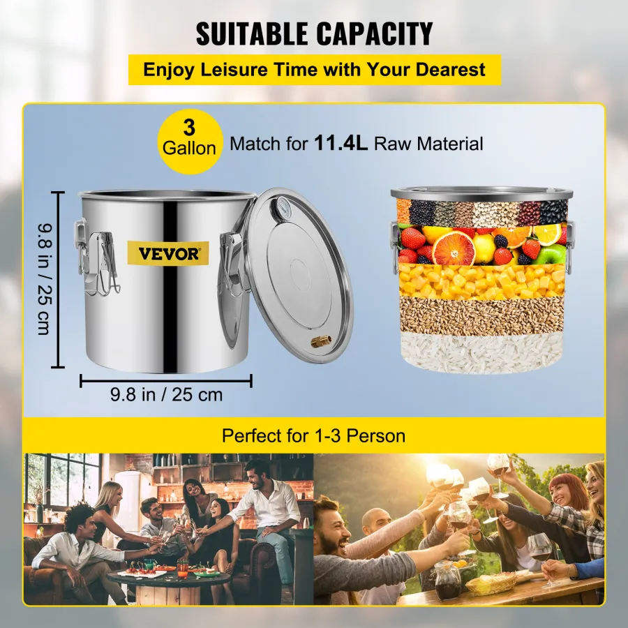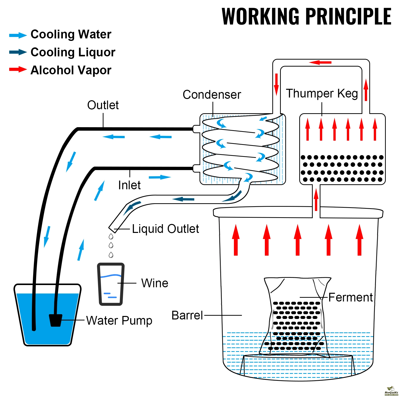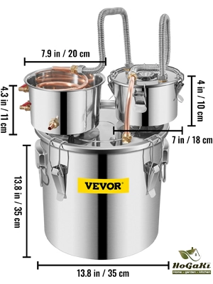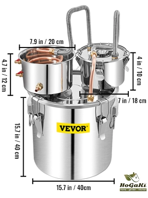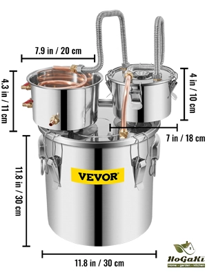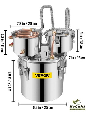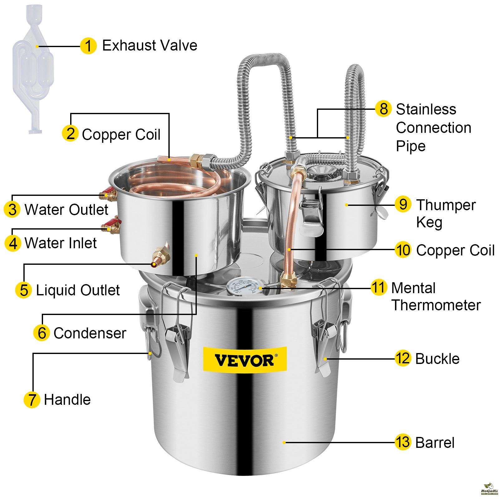 Sufficient Capacity: This alcohol still provides you with a fermentation capacity of 3 gallons. Boiler barrel: 9.8" x 9.8" (25 x 25 cm), condenser: 7.9" x 4.3" (20 x 11 cm), thumper keg: 7" x 4" (18 x 10 cm), which can ferment up to 11.4 liters of raw materials. Perfect for family-together parties. All parts are made of food-grade materials, including silicone, stainless steel, and copper.