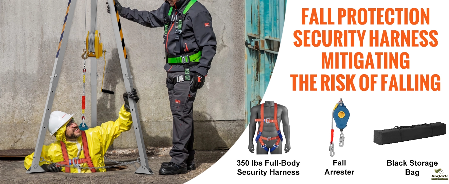 Abundant Accessories: This confined space tripod kit includes a 350 lbs full-body security harness for complete protection. Plus, an efficient fall arrester is included for those crucial moments. Everything fits snugly into the handy black storage bag for on-the-go convenience.