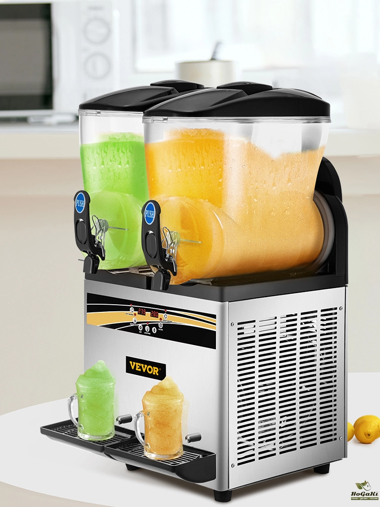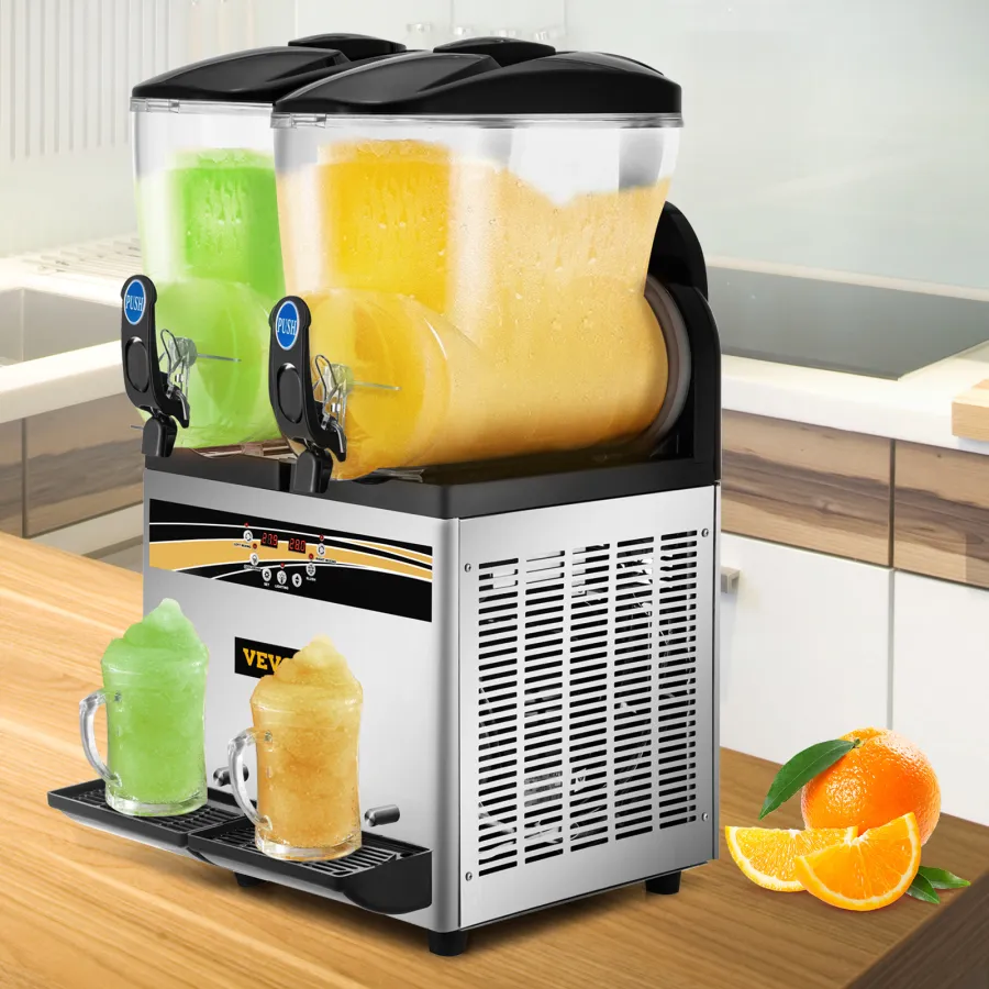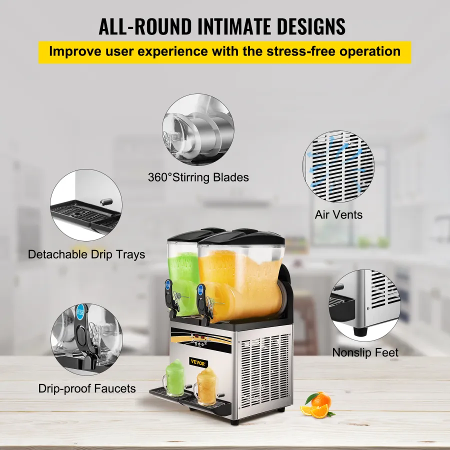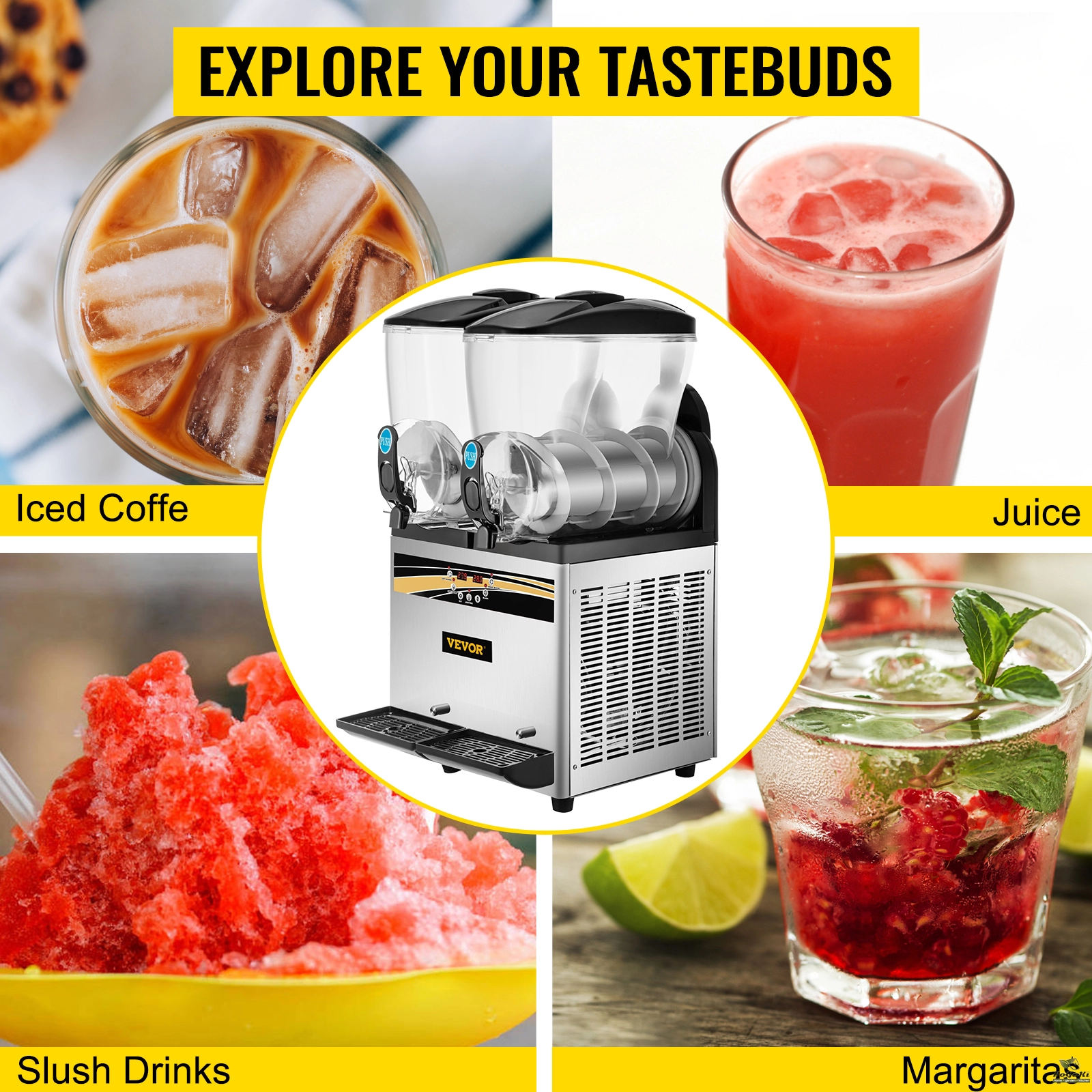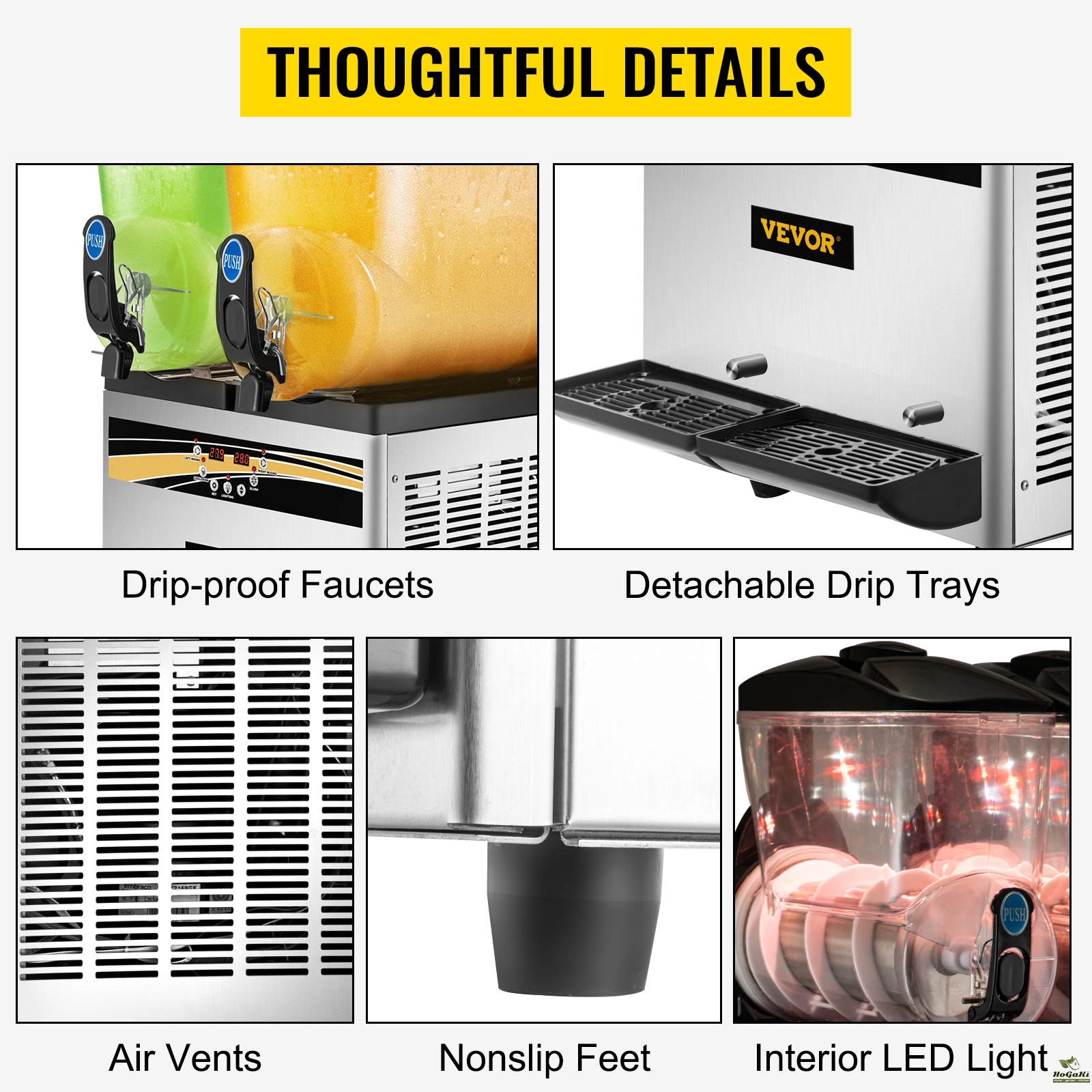 【30L/ 8GAL SLUSHIE MACHINE】 - With double tanks 15 L x 2/ 4 US gallon x 2 capacity, this frozen slush machine can hold a great number of slushies and drinks, and it can be used for different flavors. An interior bowl light illuminates your beverages, thus showcasing their vibrant colors and helping them sell themselves.