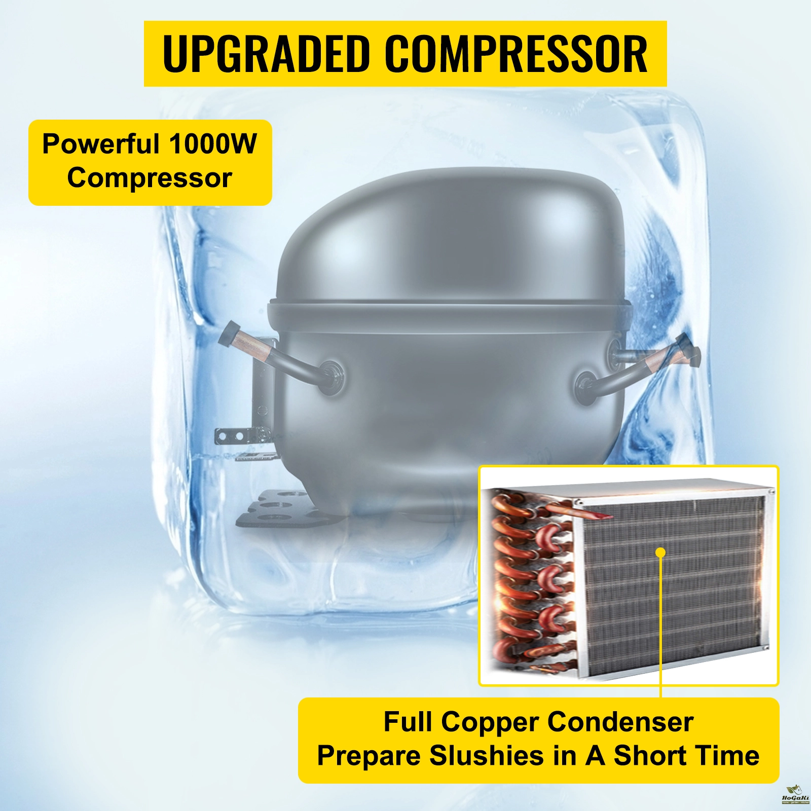 【POWERFUL COMPRESSOR】 - This frozen drink maker featuring a 1000-watt powerful compressor for rapid cooling, energy-saving, and low noise. It allows you to prepare slushies in 45-80 minutes. With the antifreeze cylinder system, the machine can automatically start and cease to solve the freezing problem of the cylinder, thus extending the machine's service life. A superior quality condenser ensures fast refrigeration and stable operation.