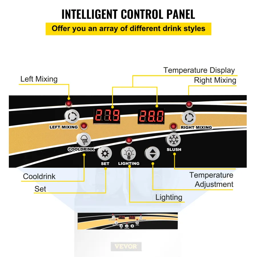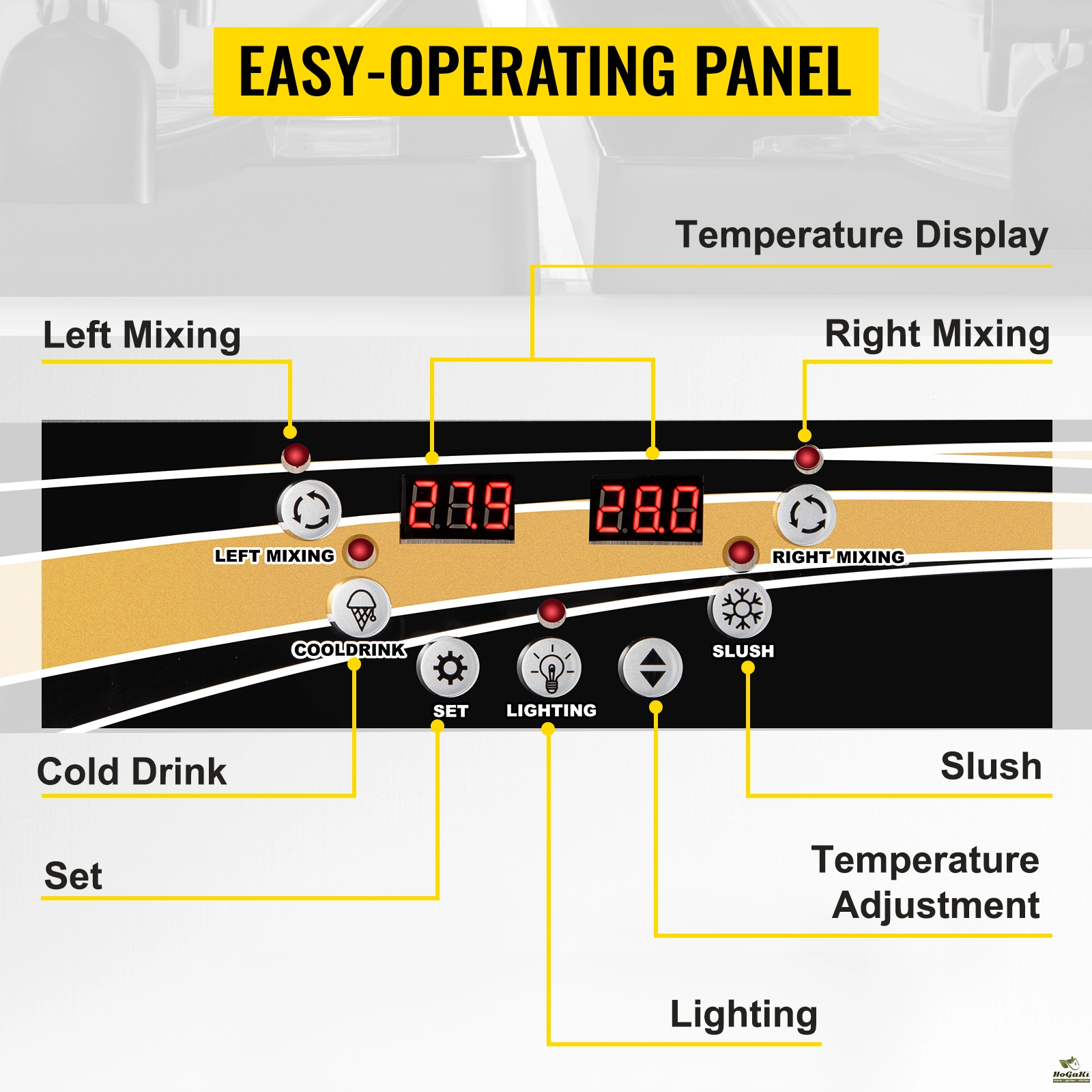 【PRECISE CONTROL AREA】 - Brief control panel is equipped on the machine. Each bowl operates independently of the other and can be switched on/off or between cool drink and slush modes. Designed with the preservation function, you can set the temperature from 26.6 °F to 28.4 °F (-3~-2 ℃) to keep the slushies fresh. You can use the panel according to your needs.