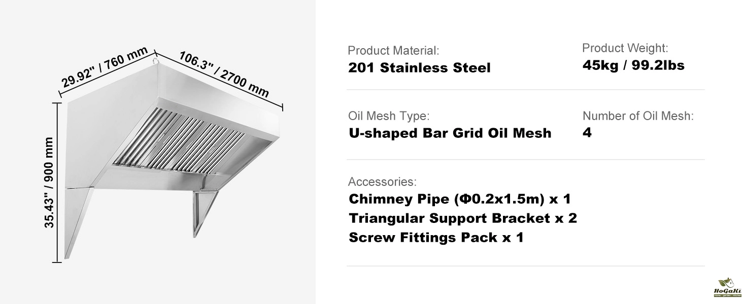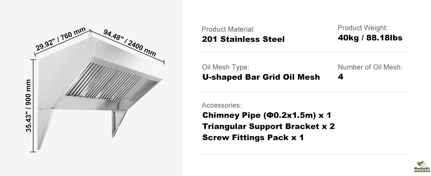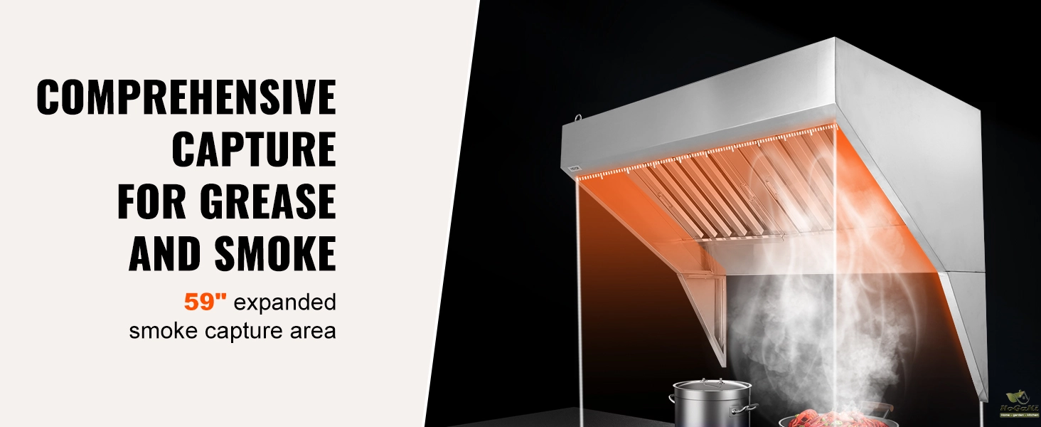 No More Cloudy Smoke: Quality stainless steel commercial exhaust hood boasts 2 more smoke-locking tripods than the ordinary exhaust hood. With 47/59/70.8/82.6/94/106-inch large space for smoke capture, our exhaust hood can be used with more than 2 cooktops at the same time, while making sure the oil smoke will not spread around. Wide smoke capture area effectively removes a large amount of smoke and cooking smell in the air.