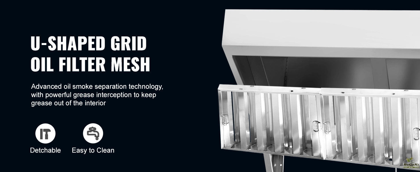 Effortless Maintenance:The two removable U-shaped grid oil filter meshes facilitate thorough cleaning inside and out. The stainless steel finish minimizes grease buildup, making it easy to maintain a fresh and hygienic kitchen environment.