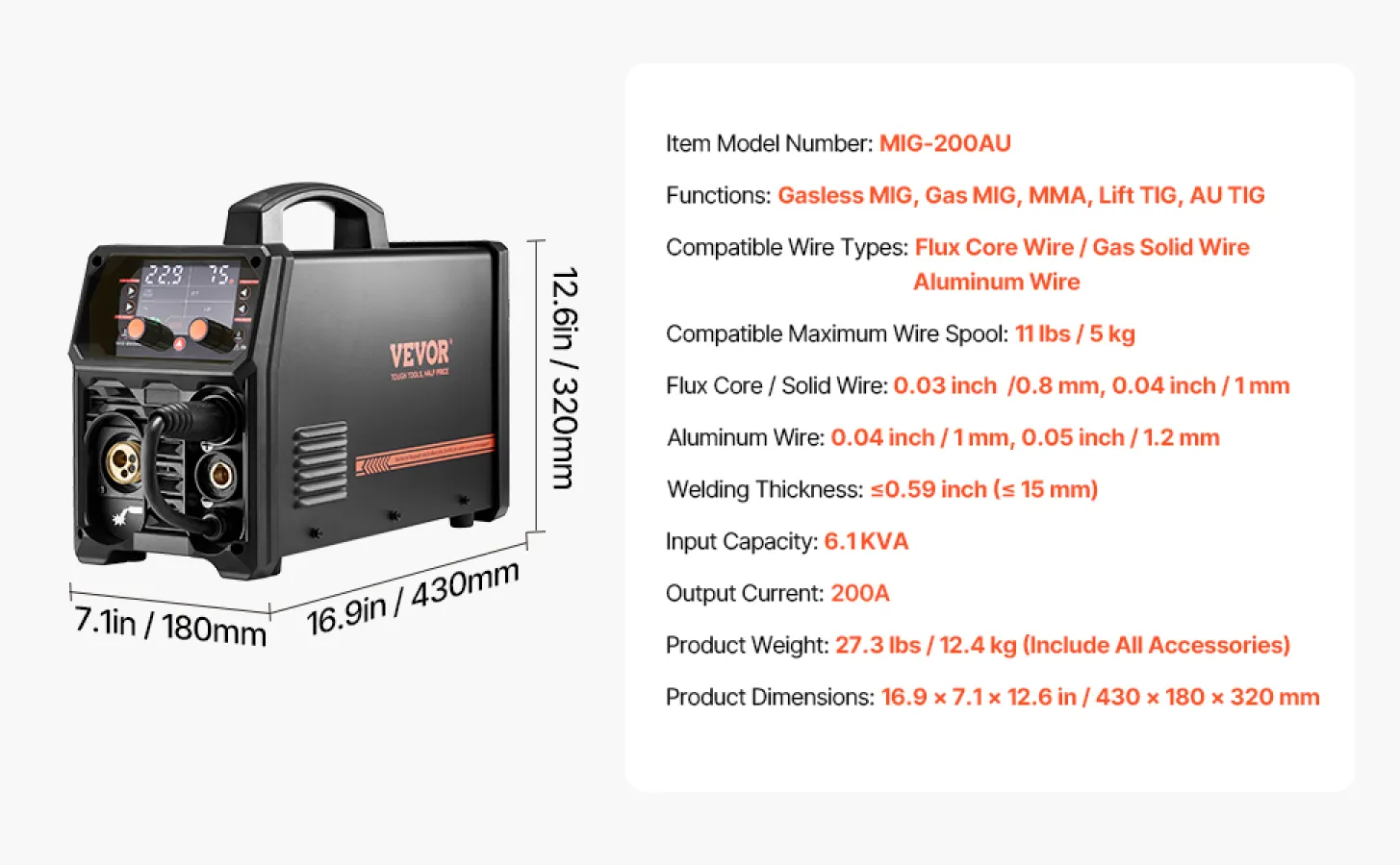 Item Model Number: MIG-200AU Compatible Maximum Wire Spool: 5 kg / 11 lbs Compatible Wire Diameter Flux Core/ Solid Wire: 0.8 mm / 0.03 inch, 1 mm / 0.04 inch Aluminum Wire: 1 mm / 0.04 inch, 1.2 mm / 0.05 inch Welding Thickness: ≤ 15 mm / ≤ 0.59 inch Product Dimensions: 430 x 180 x 320 mm / 16.9 x 7.1 x 12.6 inch Product Weight: 12.4 kg / 27.3 lbs (Include All Accessories) Functions: Gasless MIG, Gas MIG, MMA, Lift TIG, MIG Pluse Compatible Wire Types: Flux Core Wire / Gas Solid Wire / Aluminum Wire Input Capacity: 6.1 KVA Output Current: 200A/li>