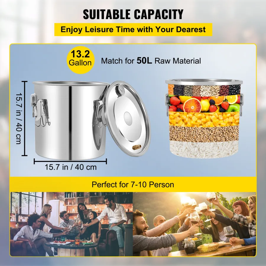 This alcohol still boasts a generous 13.2-gallon capacity, with a boiler barrel measuring 15.7""x15.7"" (40x40 cm) and a condenser at 7.9""x4.7"" (20x12 cm). It can handle up to 50 liters of raw ingredients, making it ideal for large gatherings. Crafted from food-grade silicone, stainless steel, and copper, it ensures safety and durability.