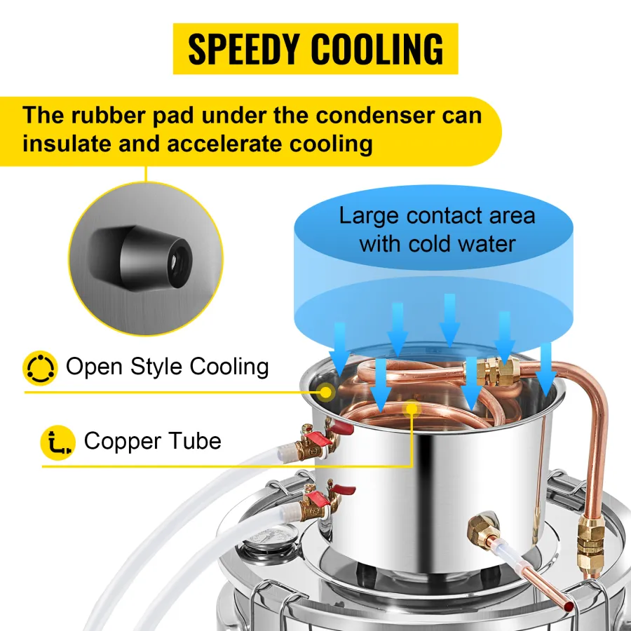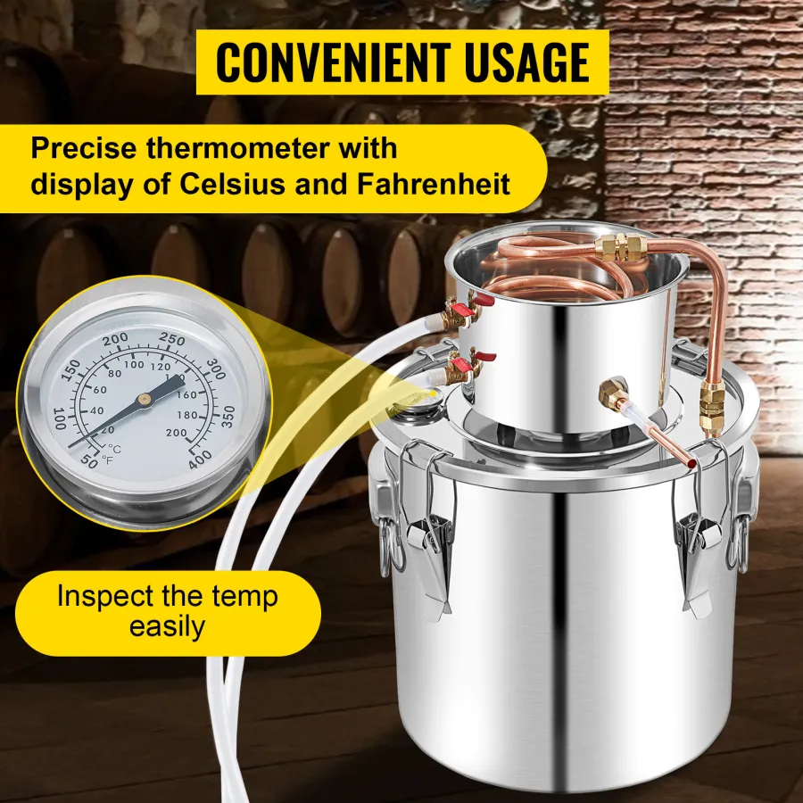 This still is adaptable for a variety of uses, including making Whiskey, Wine, Brandy, Rum, Tequila, Vodka, Water Distiller, Ethanol, and Essential Oils. Its reinforced bottom supports different heating sources like gas stoves, firewood, and electric ceramic heaters.