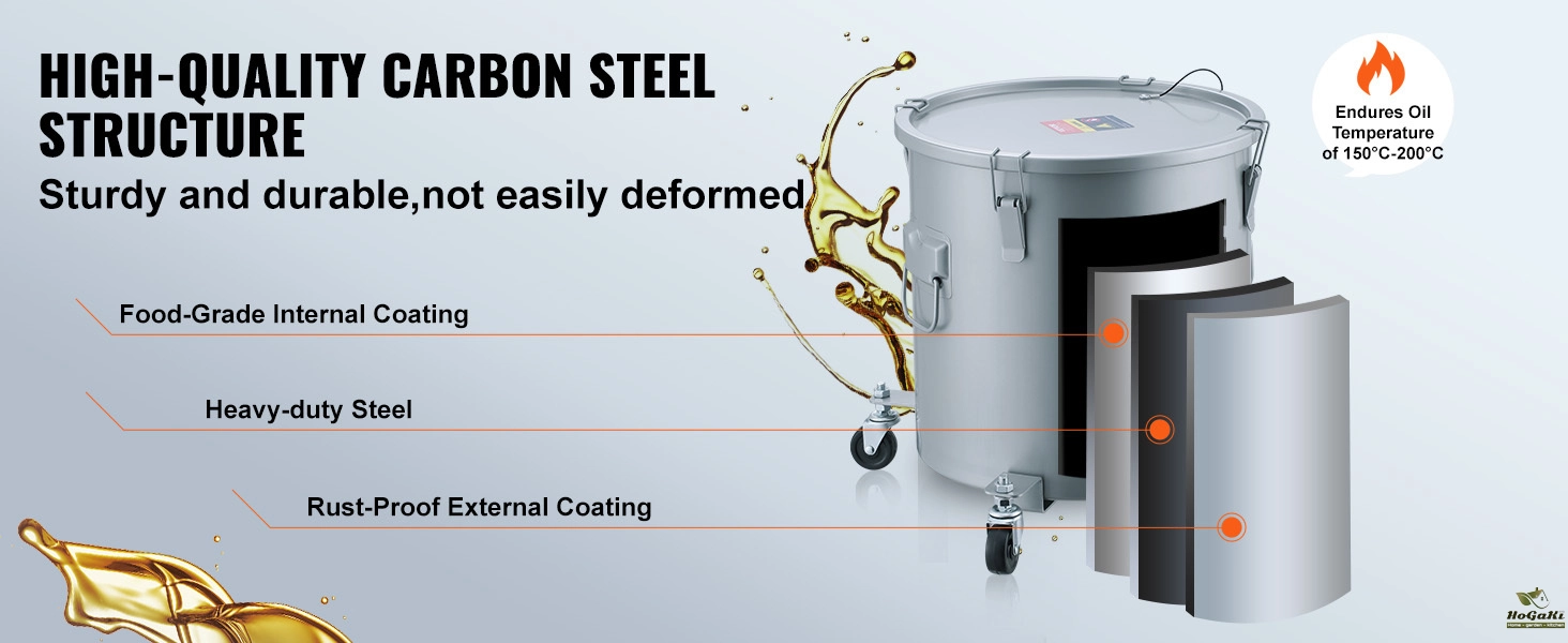 Heavy-Duty Carbon Steel: Crafted from heavy-duty carbon steel (about 0.7 mm thick), this oil disposal caddy is built to last. Coated inside and out, it's rust-resistant and won't spoil your precious cooking oil. The upgraded high-temperature powder coating means it can handle up to 200°C. No more waiting for your oil to cool down!