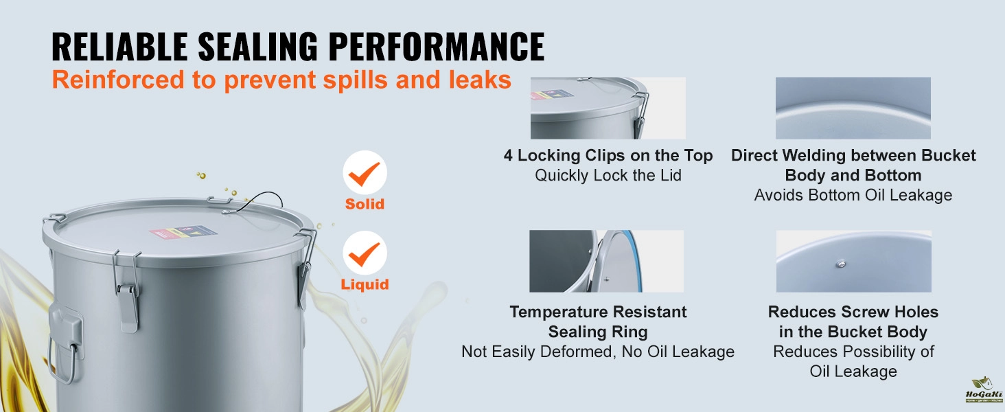 Excellent Sealing: Say hello to four handy quick-locking clips! They snugly secure the lid with just a simple press. And with a built-in high-temperature-resistant sealing ring, you can kiss leaks goodbye! No spills, no mess—just sealed freshness all the way. Plus, the grease bucket body is welded to the bottom to prevent any sneaky oil leaks.