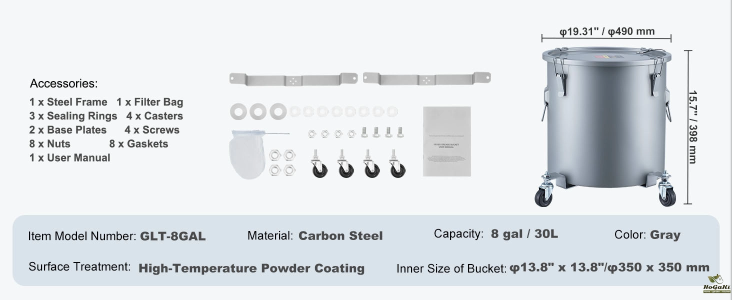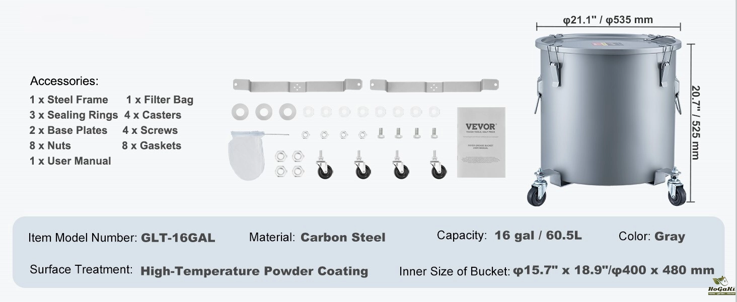 Massive 8/10/16-Gallon Capacity: With dimensions of 21.1"/535 mm in diameter and 14.6"/370 mm in height, this fryer grease bucket packs a punch! Say goodbye to frequent trash can emptying—it can hold up to 10 gallons of oil! Plus, we've thrown in a nifty filter bag to sift out any pesky impurities, keeping your oil fresh and clean for longer.