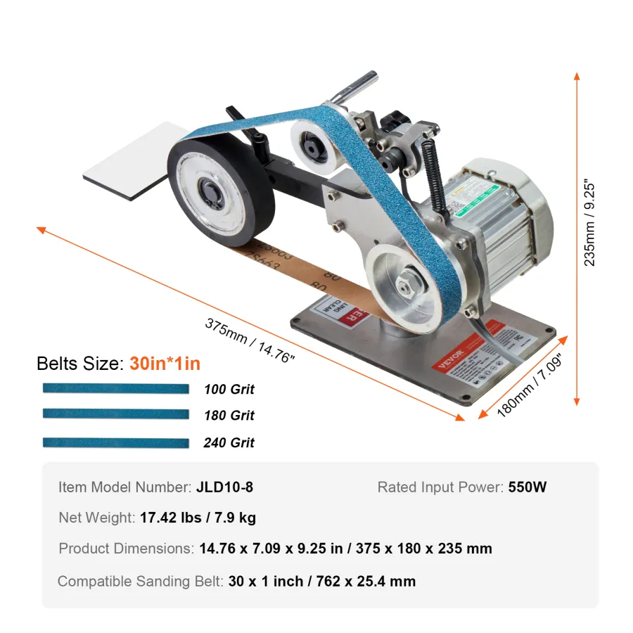 Item Model Number: JLD10-8 Product Dimensions: 375 x 180 x 235 mm (14.76 x 7.09 x 9.25 in) Rated Input Power: 550W Net Weight: 7.9 kg (17.42 lbs) Compatible Sanding Belt: 762 x 25.4 mm (30 x 1 inch)/li>
