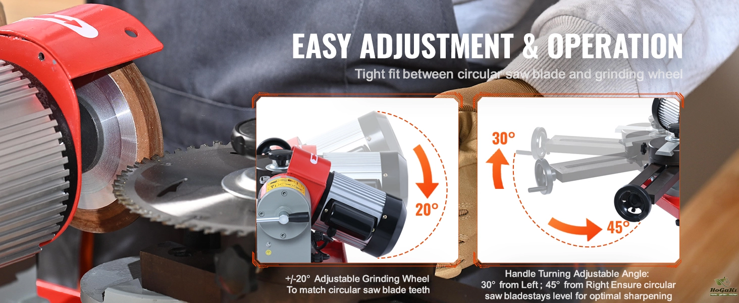 Easy Adjustment for Precision Sharpening: Our rotary angle mill grinder's grinding wheel can be effortlessly adjusted up and down by 20°. You can also turn the handle 30° from the left, and 45° from the right, ensuring that the circular saw blade remains level for precise sharpening.