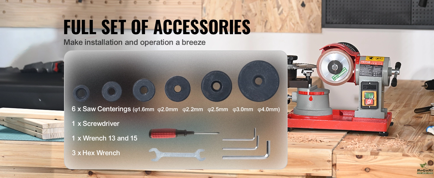 Comprehensive Accessory Set: Effortlessly install the rotary angle mill grinding sharpening machine with our rich assortment of accessories. We provide 6 saw centerings, a screwdriver, a 13/15 wrench, and 3 hex wrenches for your convenient setup and adjustments.