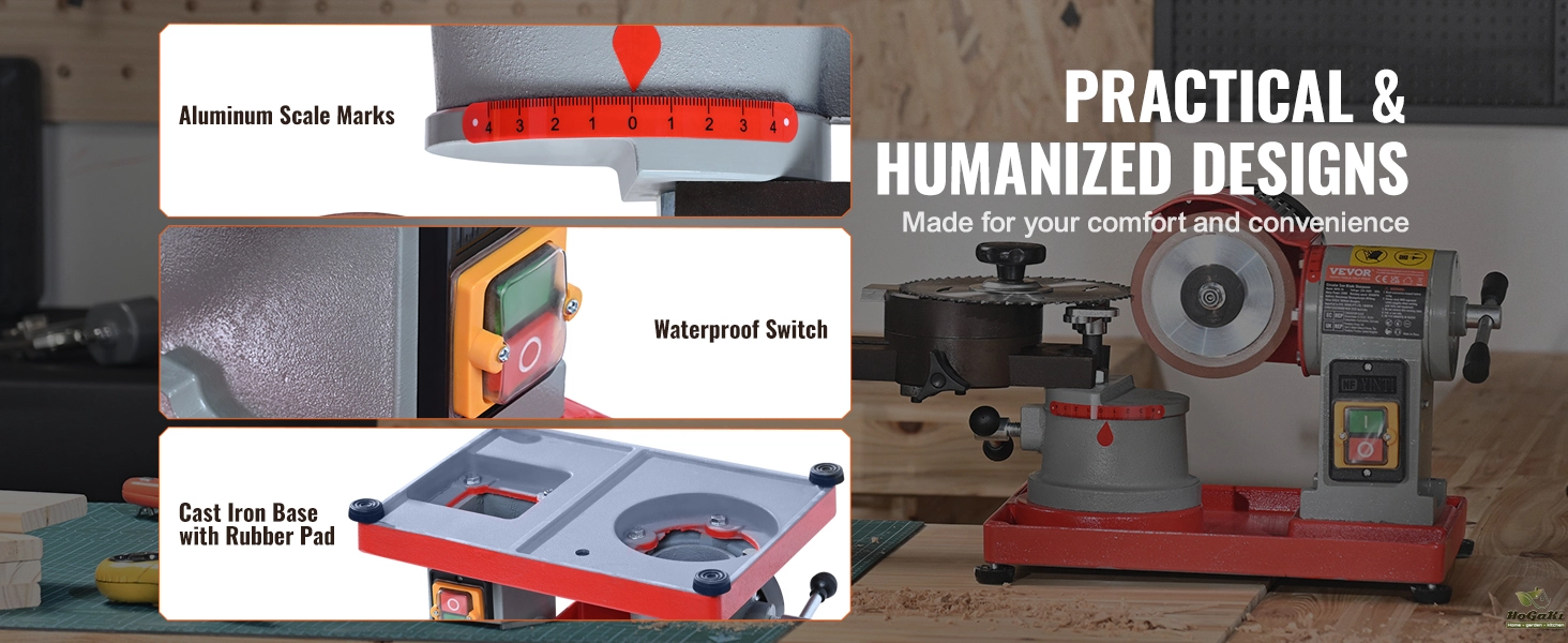 Practical & Humanized Designs: Quality in the details! Our carbide blade sharpener is optimized with numerous thoughtful designs: Clear and precise aluminum scale marks, a waterproof switch for safety and longevity, and cast iron base with a rubber pad that enhances stability and minimizes vibrations.