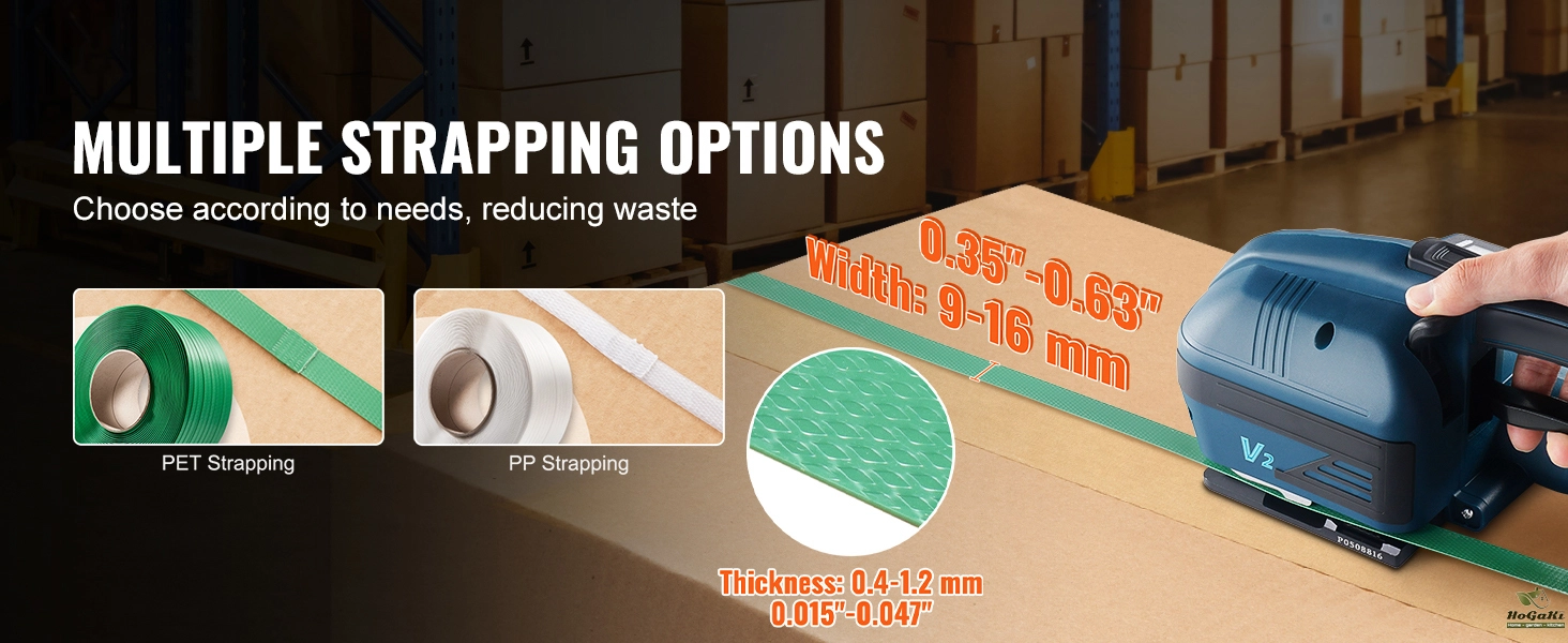 Versatile Strapping Options: Our electric strapping machine works great with polypropylene (PP) and polyester (PET) strapping bands. It handles widths from 0.35" to 0.63" and thicknesses from 0.02" to 0.05". This means you can easily pack items of different sizes and weights, saving you cost by choosing the right strap for the job.