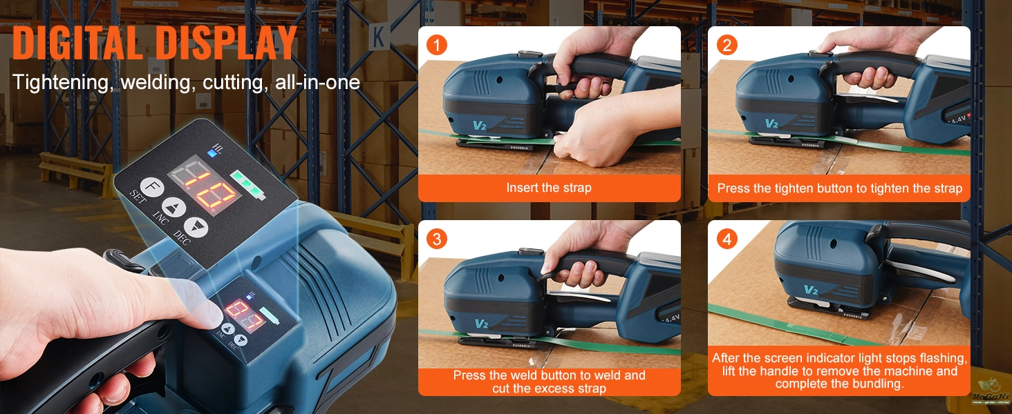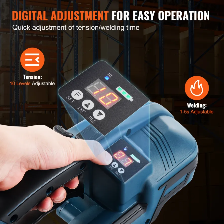 Easy to Use: This smart strapping machine comes with a digital display for super easy operation. One-button start, quick positioning, and intelligent sensing make strapping a breeze. You can adjust it to fit different sizes and shapes of goods, making your work easier and more fun.
