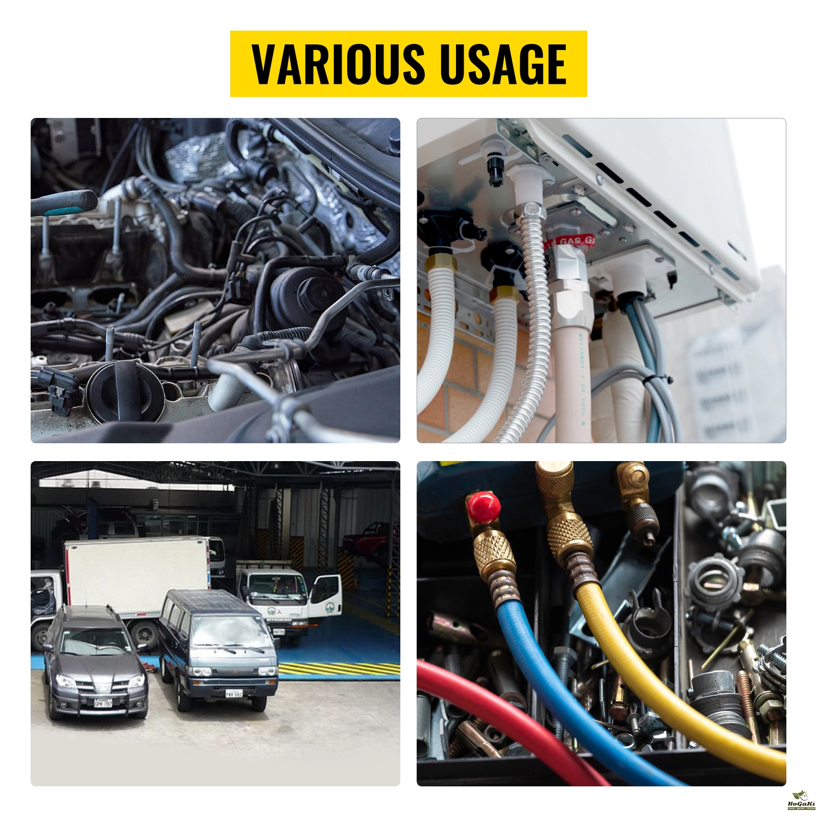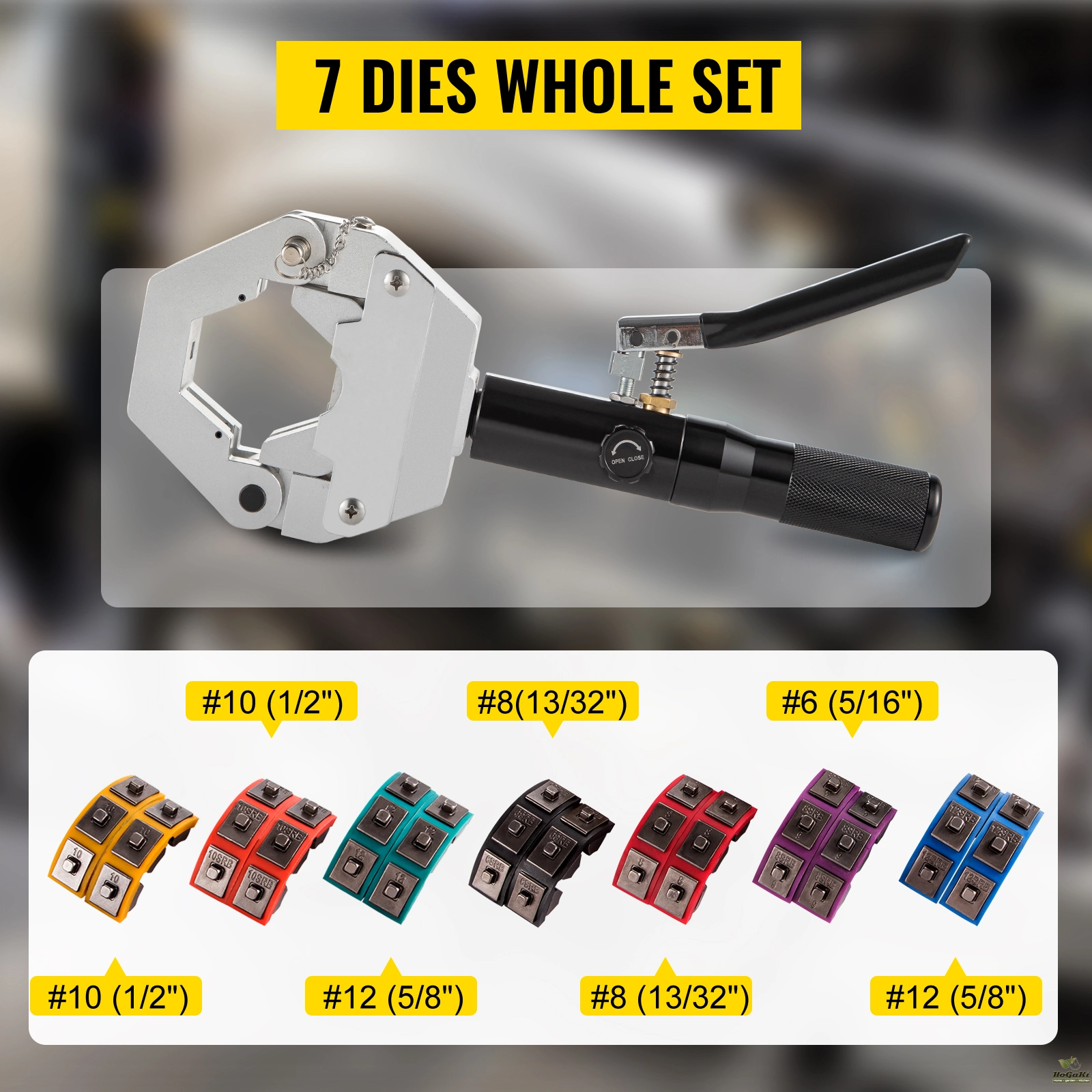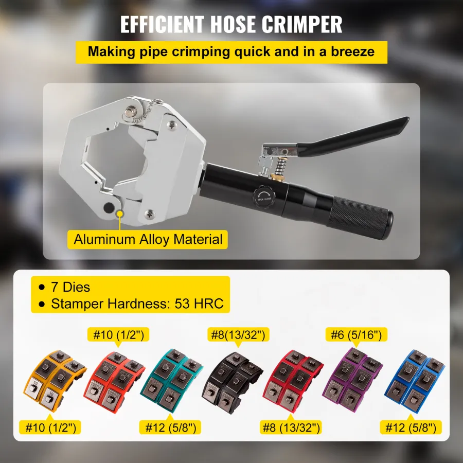 Heavy-Duty Crimping Performance: Made from high-quality aluminum alloy, this crimper boasts a hardness of 53 HRC, enabling it to handle large forces. It comes with 7 dies in various sizes, making it perfect for a range of A/C hose fittings (5/16", 1/2", 5/8", and more).