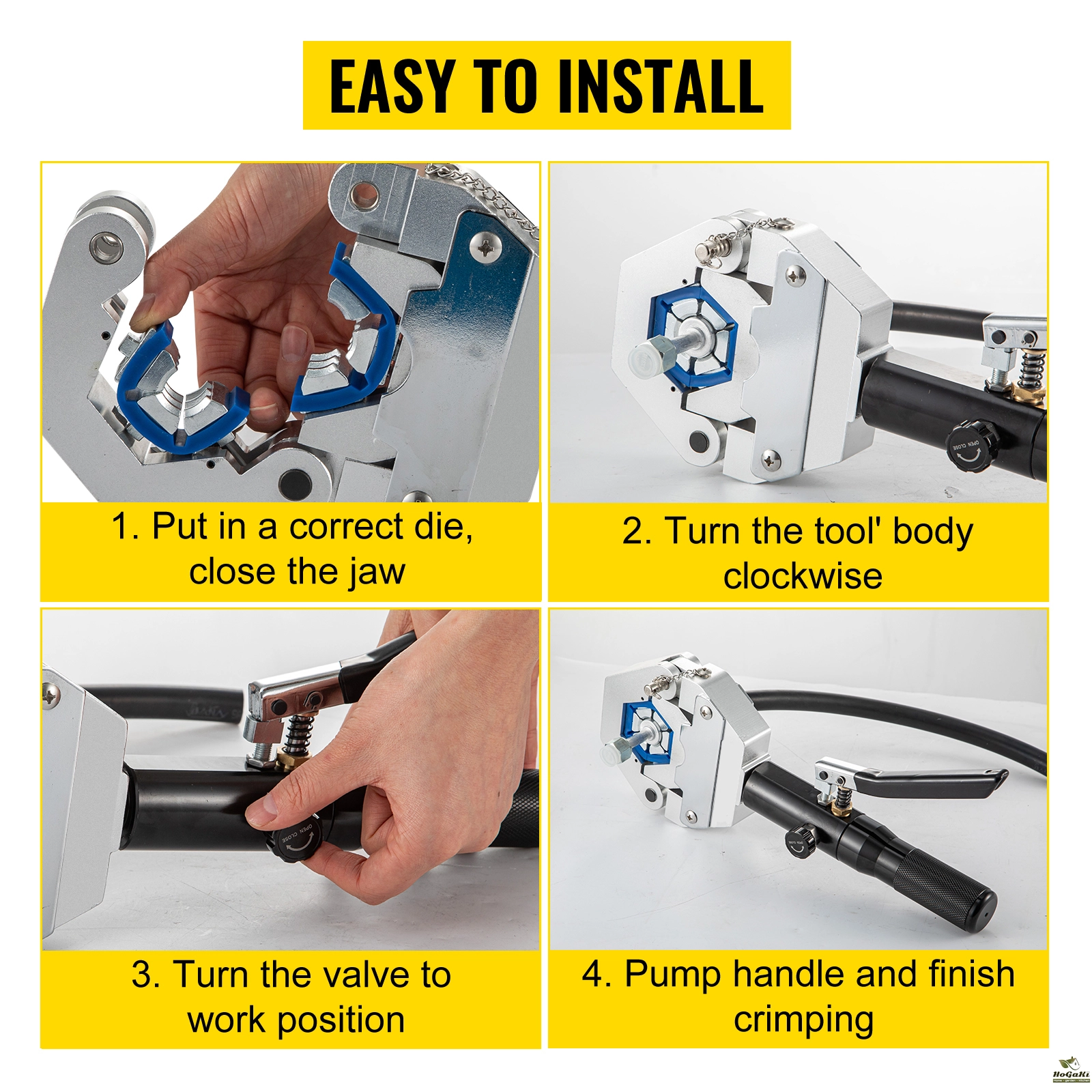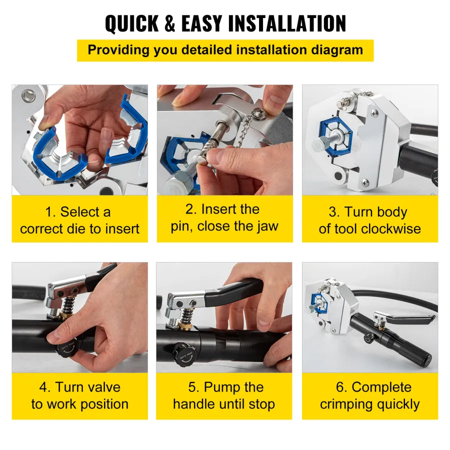Efficient & User-Friendly Setup: Installing the crimping tool is straightforward: simply choose the appropriate die, insert the pin, and secure the tool. After turning the valve to the working position, just pump the handle until the crimp is complete.