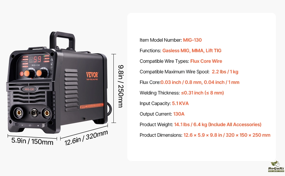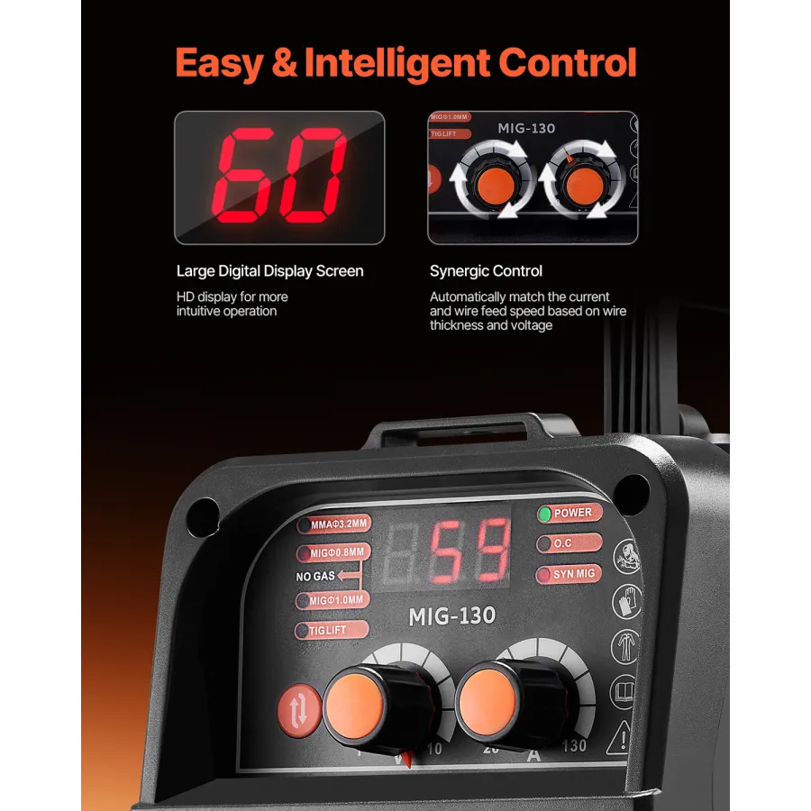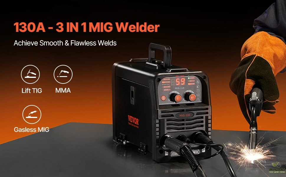 3-in-1 MIG Welder: This 130Amp 3-in-1 mig welder supports multiple welding functions - lift TIG, gas flux core MIG, and MMA welding. Versatile and efficient, it easily handles various materials and welding scenarios, providing a convenient and high-performance solution for your welding tasks. (Note: Lift TlG Torch is not included)