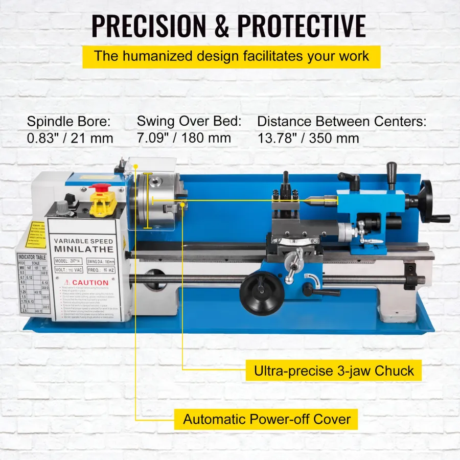 【Large Working Capacity】: This metal working lathe cranks out 550W and handles small to medium projects. It provides a 7.09" / 180 mm swing over bed and 13.78" / 350 mm center distance so that you can manage more extensive projects.
