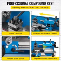 【Professional Construction】: 4-way quick change tool post can install 4 standard turning tools at the same time. You can adjust tool post forwards/backward by turning blade adjusters with accurate scales clockwise/anticlockwise.