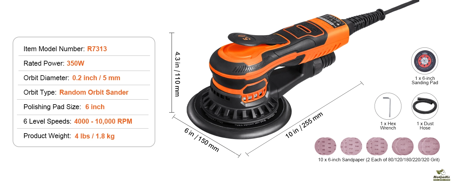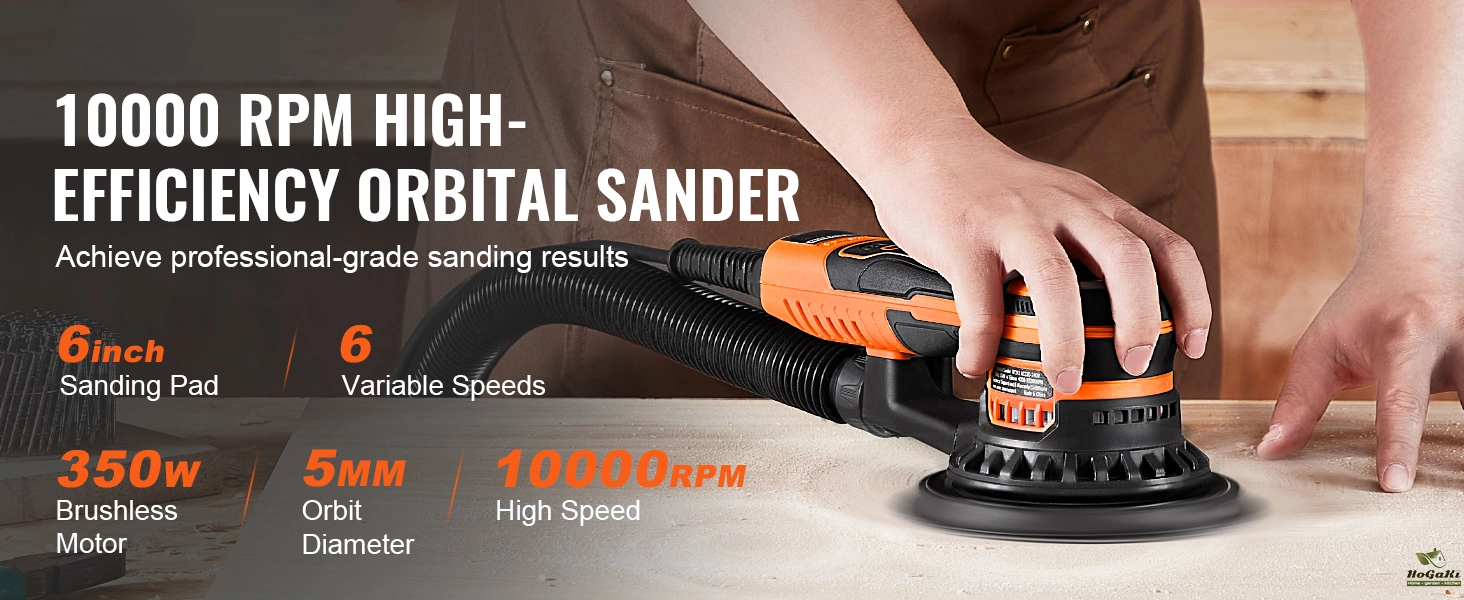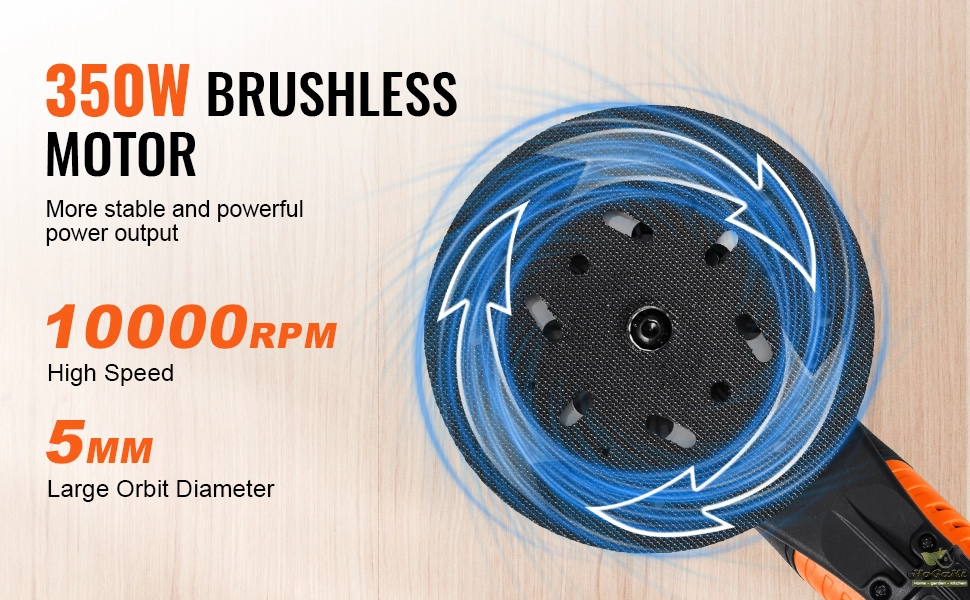 Efficient Sanding, Flawless Finish: Powered by a 350W brushless motor, this 6-inch random orbital sander delivers robust performance with low noise, high efficiency, and long lifespan. With a maximum speed of 10,000 RPM and a 5mm large orbit diameter, it ensures smooth, professional sanding results on various materials.