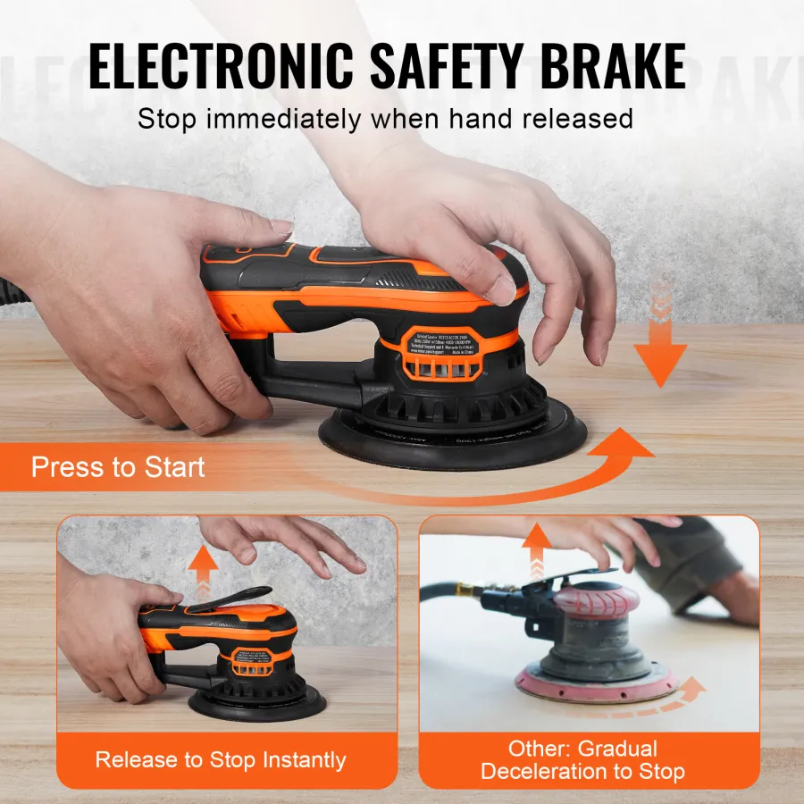 Enhanced Safety: This electric random orbital sander features an "instant stop" function that that halts rotation when the handle is released, providing added safety during operation. It also includes a dust connector and hose, allowing for easy connection to a vacuum cleaner for efficient dust collection.