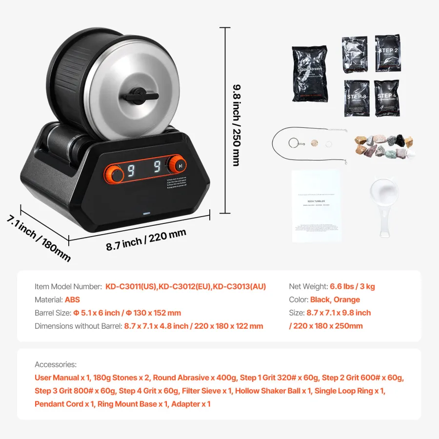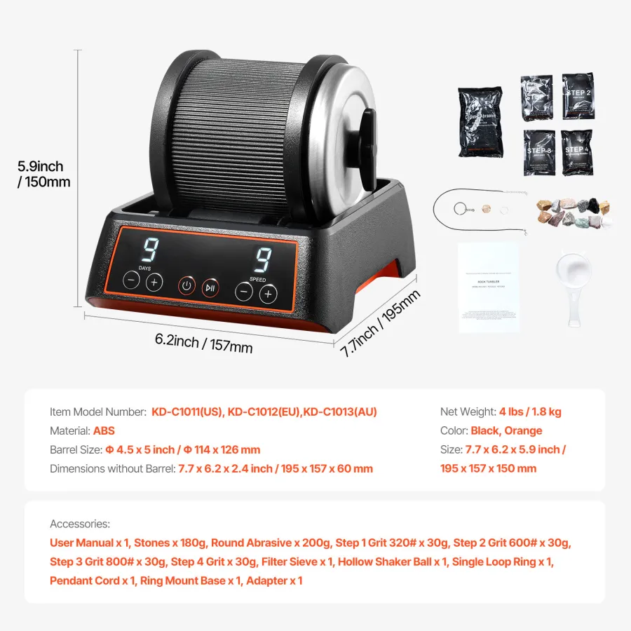 Choose from 9 precise speed settings for each tumbling stage and set the timer up to 9 days. Let the SucceBuy stone tumbler work while you focus on other things.
