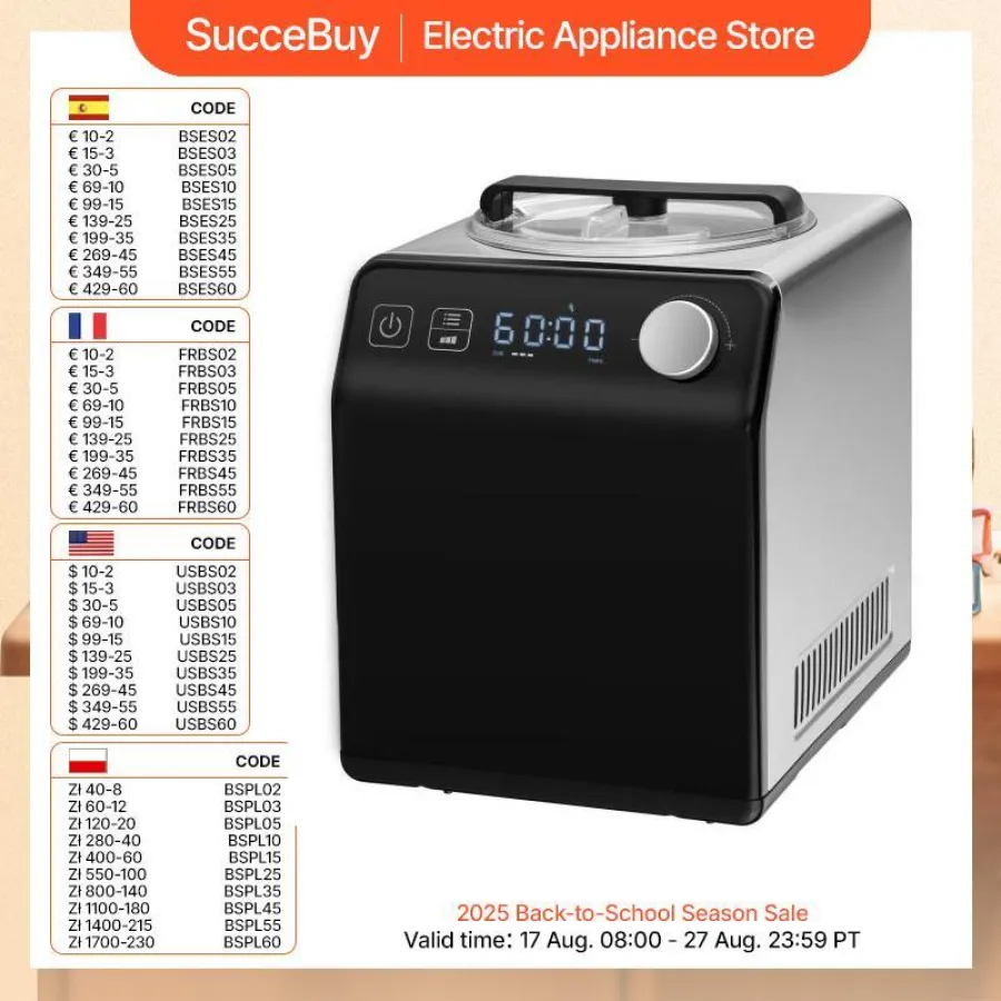 Powered by a robust 180W compressor, this 2qt ice cream maker can create up to 15 scoops of delicious ice cream in one go—perfect for satisfying the cravings of a large family or group.