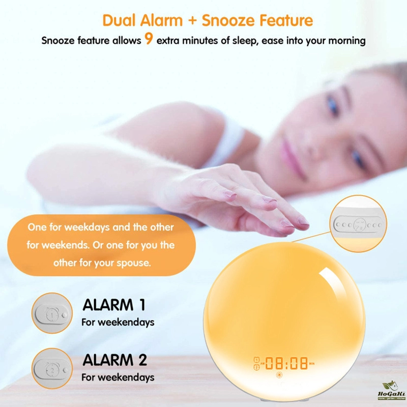 【Dual Alarm Clock & Snooze supported】Considering you may need to set up different alarms for your family member, we designed 2 alarms for you. includes 7 natural sounds &FM radio and 16 sound volume.Also, the function of snooze is specially designed for those who needs an extra 9 minutes to start a fresh day. You just need to press the "Snooze" button at the top of the clock, you will get more 9 mins to sleep. Up to 5 times snooze. it is a perfect alarm clock for heavy sleepers adults and kids.