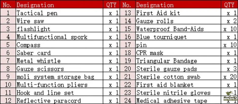 1 | Tactical pen | x 1 | 13 | First Aid kit | x 1 |