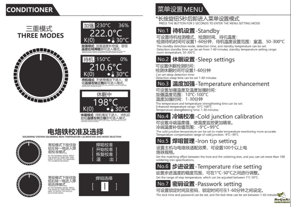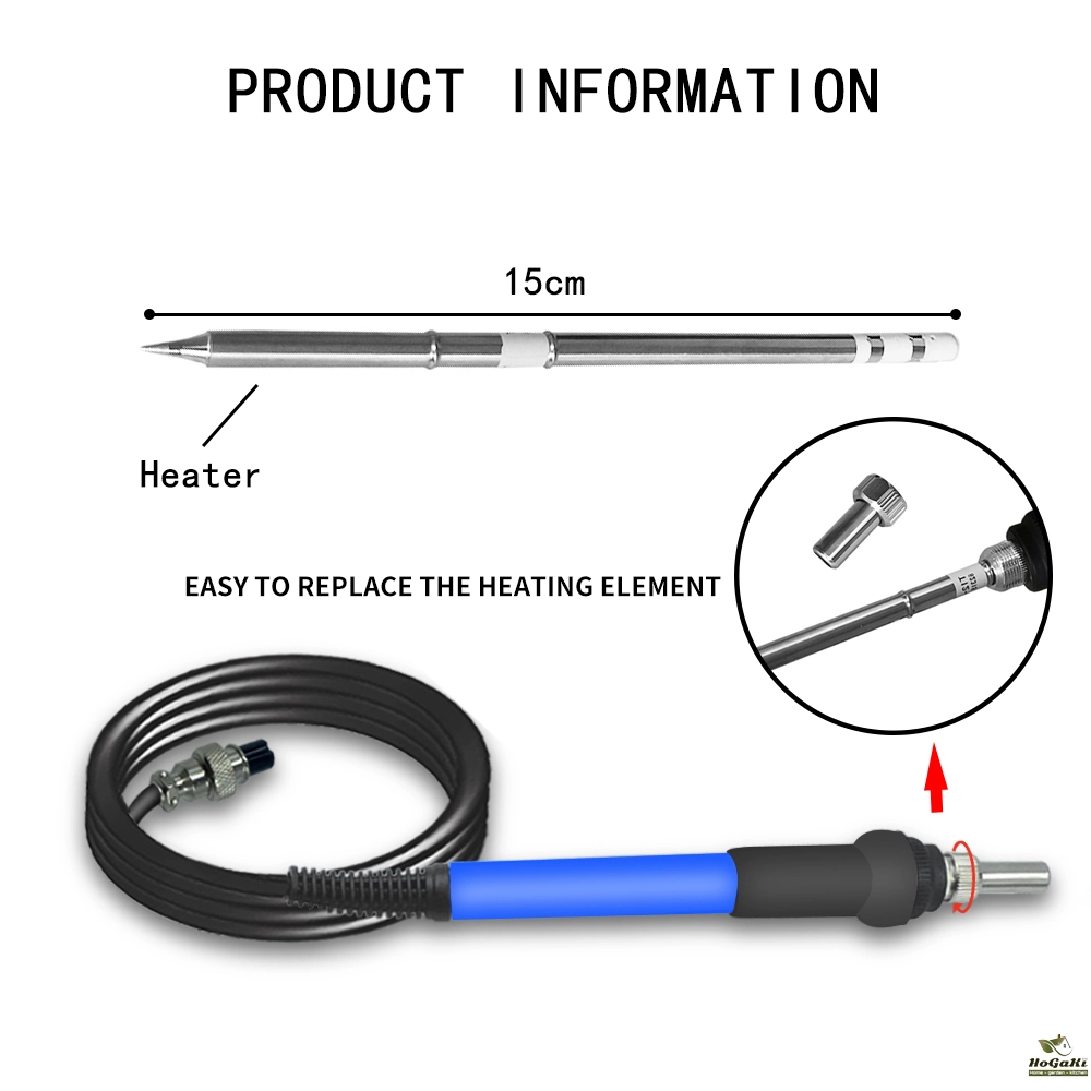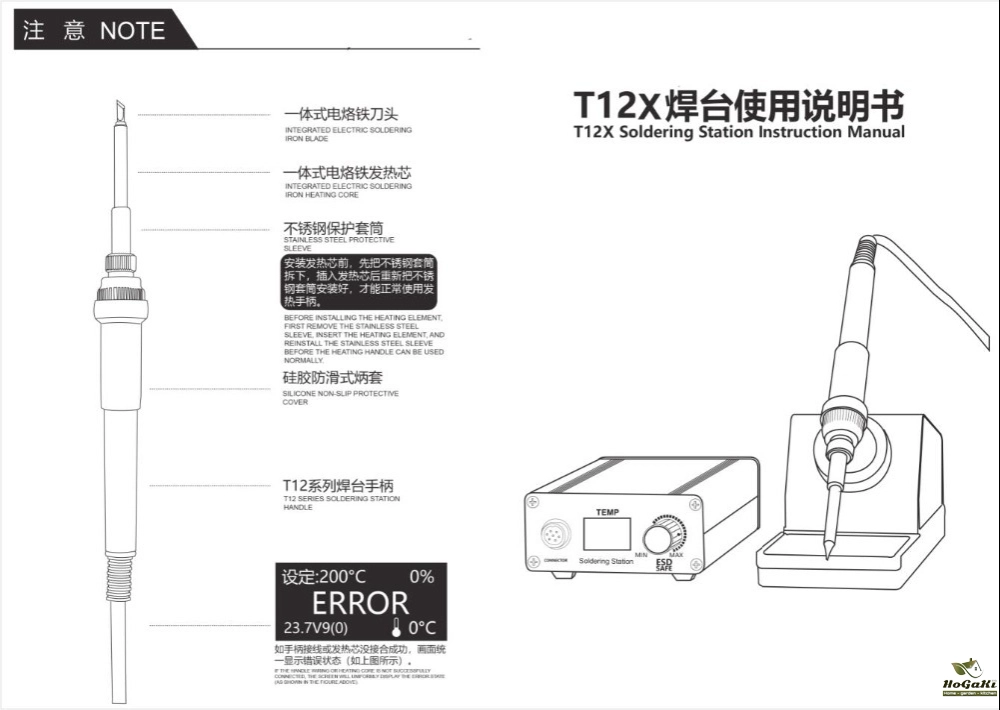 5. The handle vibrates during the welding process, and the hundred decimal point will flash to show the vibration sensor action. 6. When not welding for a long time, the control panel will automatically wait for 200 degrees according to the menu setting time and then automatically shut down automatically. Raise the handle or turn the encoder to restore the original set temperature.
