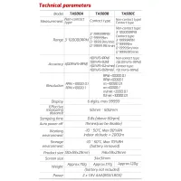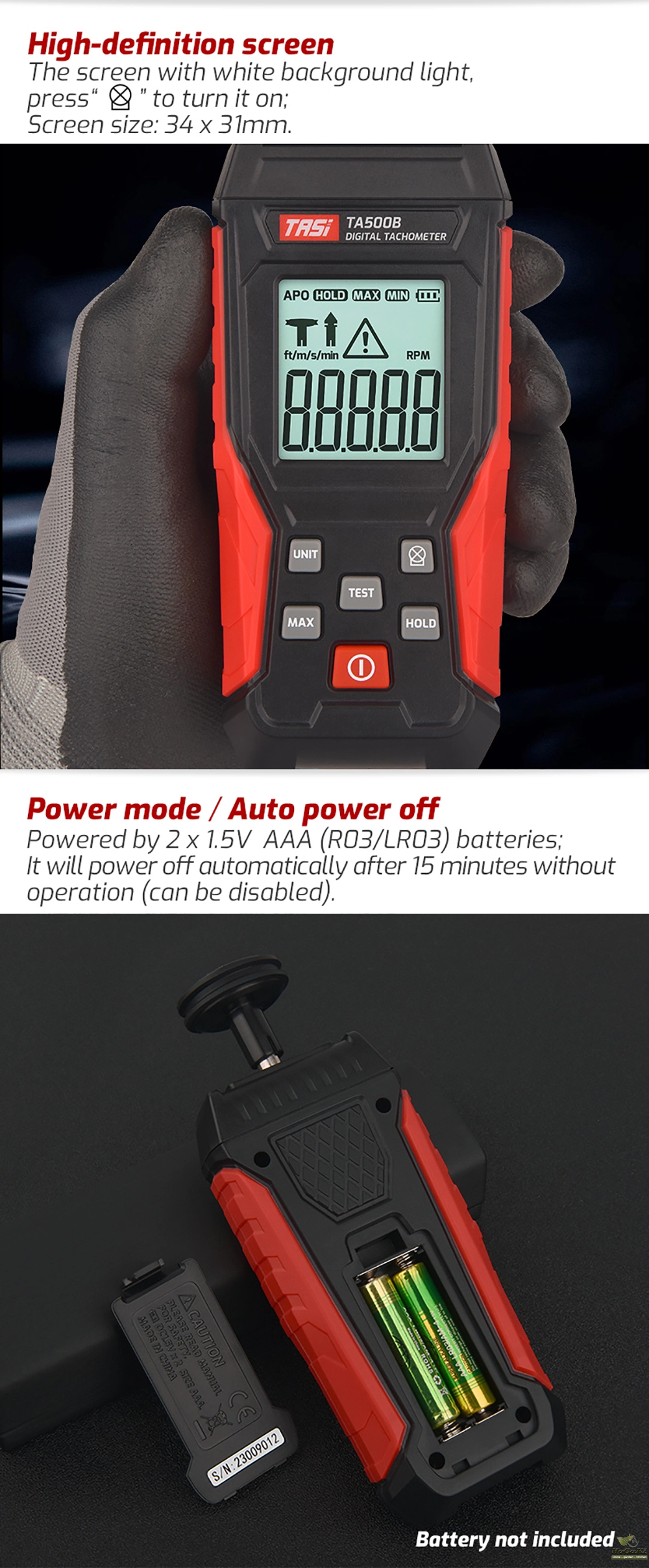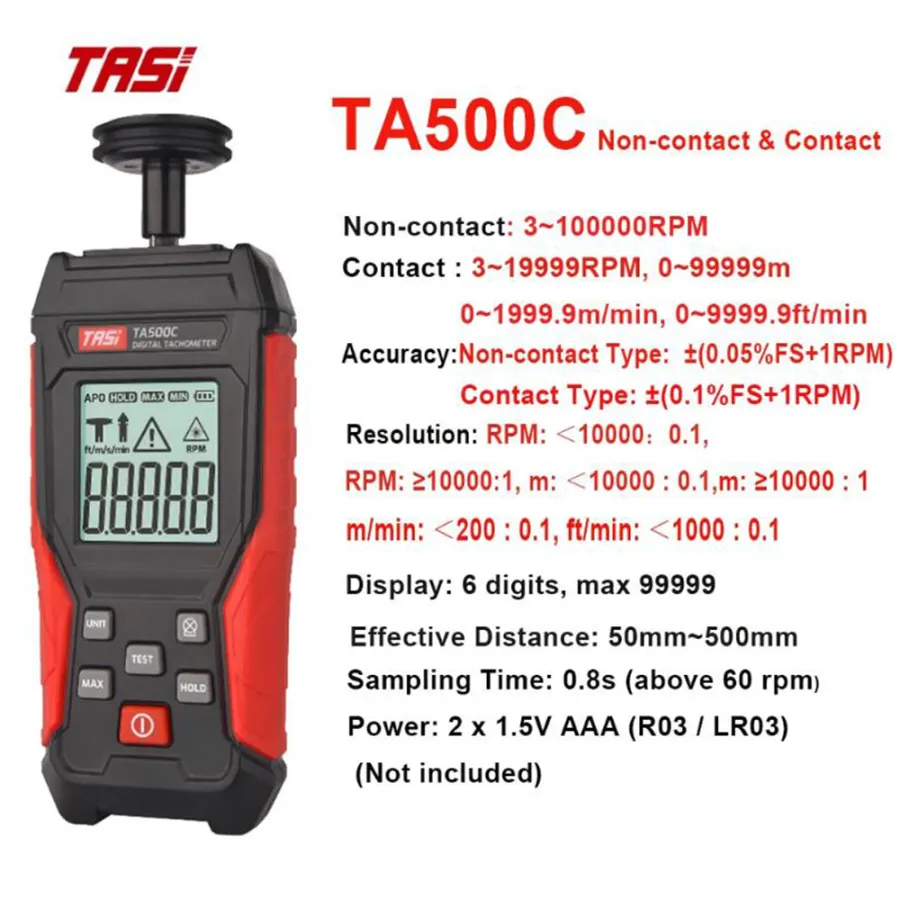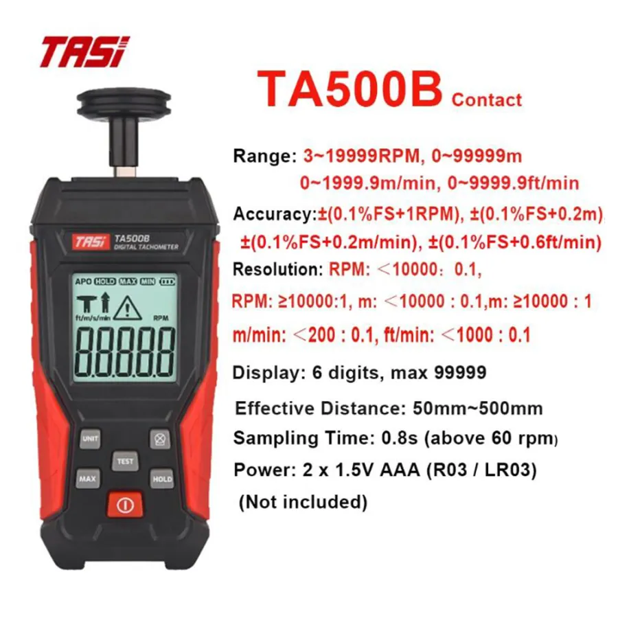 TA500B: Contact: 3~19999RPM, 0~99999m, 0~1999.9m/min, 0~9999.9ft/min